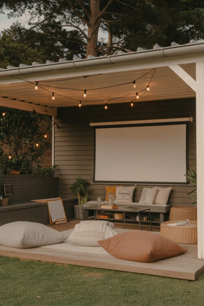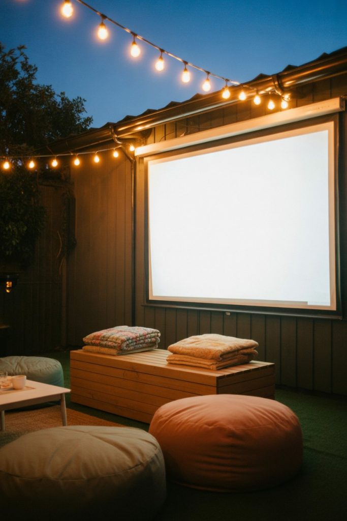 Mount a weatherproof projector screen or hang a white sheet against a patio wall, add floor seating with outdoor bean bags or poufs, and string café lights overhead. This transforms any backyard into an entertainment venue for summer movie nights. Keep a storage bench nearby with blankets for cool evenings. This setup thrives in suburban neighborhoods where backyards offer privacy and space.