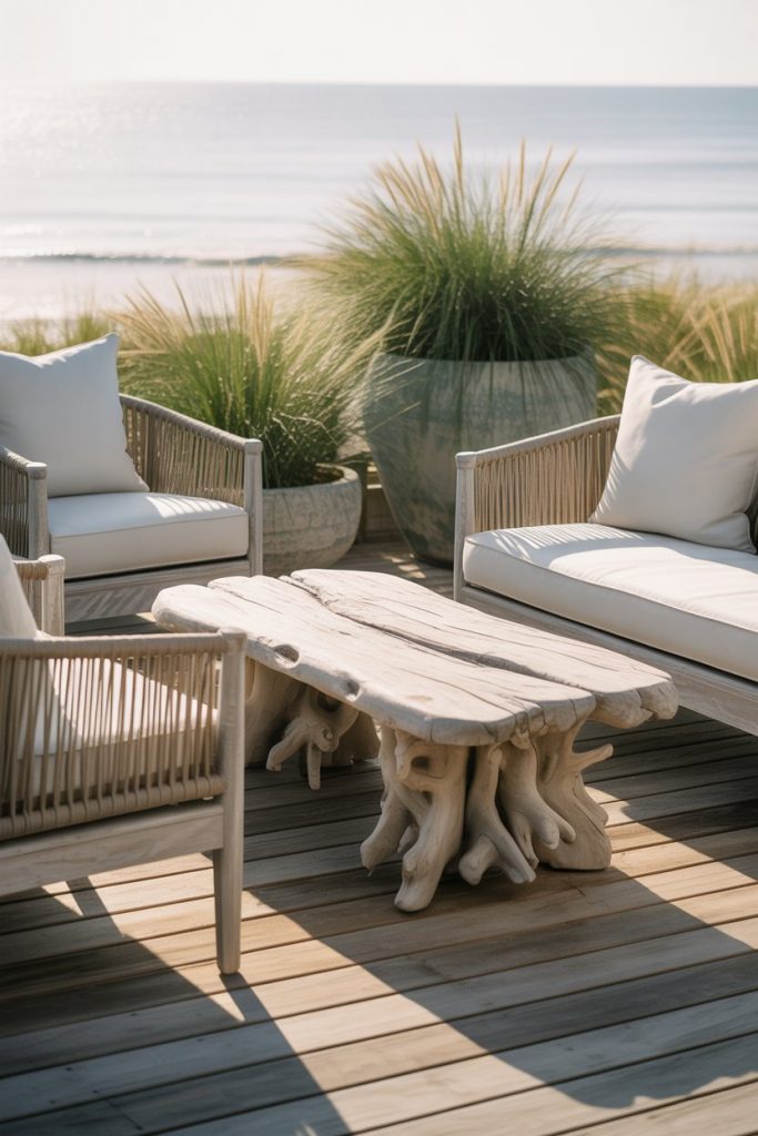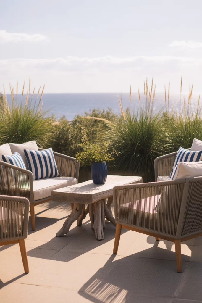 Channel beachside vibes with outdoor furniture featuring rope details, driftwood coffee tables, and coastal plantings like sea oats or blue fescue. Use a palette of whites, blues, and sandy neutrals. This aesthetic works beautifully on front porches and patios in coastal states from Maine to Florida, as well as lakeside properties across the Midwest.