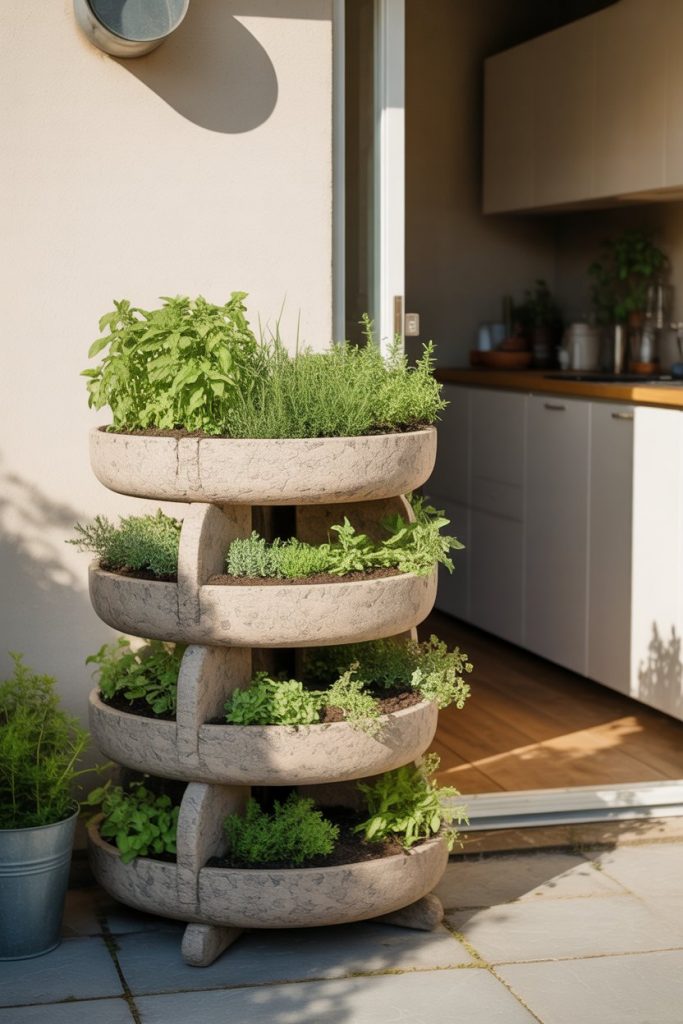 Build a raised spiral planter near your patio to grow culinary herbs at different moisture and sun levels. Plant Mediterranean herbs like rosemary and thyme at the sunny top, and moisture-loving parsley and cilantro at the base. This functional outdoor feature works on apartment cheap patios when built in a compact 4-foot diameter, and scales up for larger suburban yards.