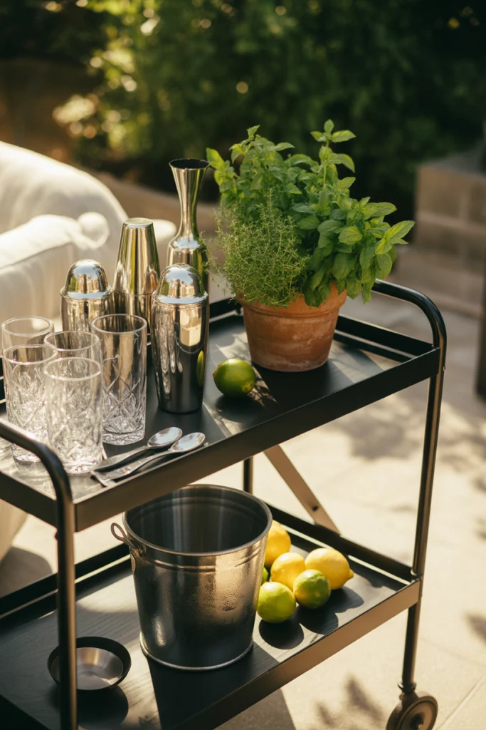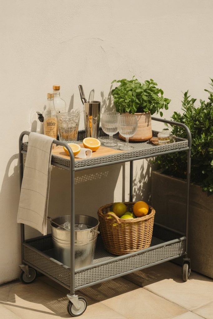 Set up a mobile bar cart with weather-resistant finishes as a beverage station for entertaining. Stock it with outdoor glassware, cocktail supplies, and a small ice bucket. This works beautifully on large patios where you host frequently, and tucks into corners on small apartment balconies when not in use. Roll it indoor during inclement weather to protect contents.