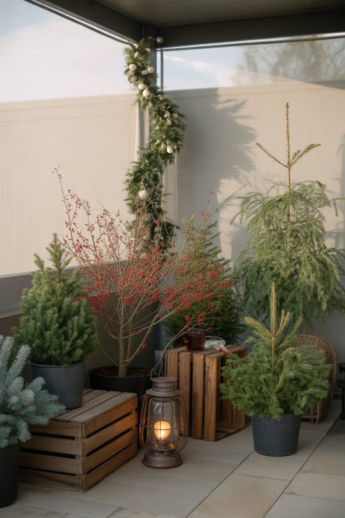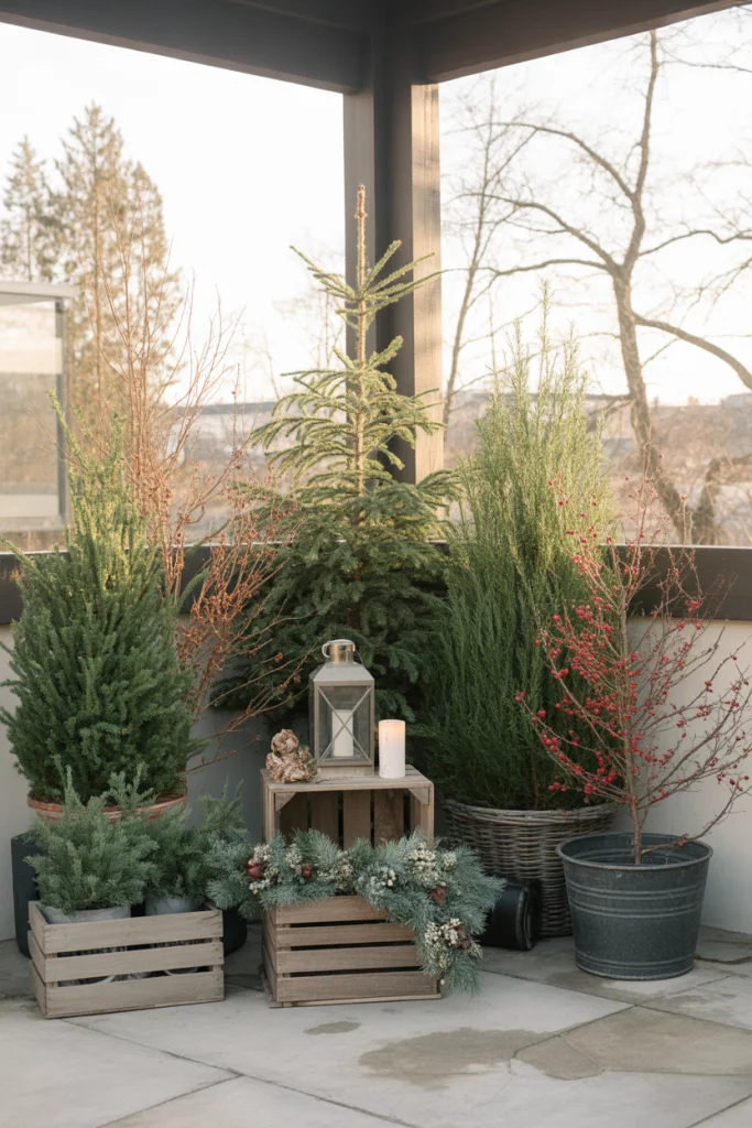 A Christmas-themed patio doesn’t have to wait until December. Create a year-round evergreen corner with potted conifers, winterberry shrubs, and seasonal accents that shift with the calendar. In warmer months, swap ornaments for citrus garlands or dried florals. This setup thrives in covered patios where plants receive indirect light and protection from harsh afternoon sun, especially across the Southwest and Southeast regions.