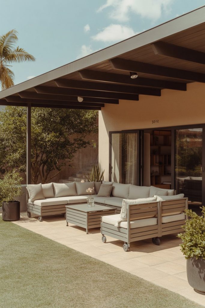 Design your patio with modular furniture that adapts to seasonal needs—ottomans that store cushions, tables that fold flat, and planters on casters. In summer, spread elements wide for entertaining; in winter, consolidate them into a compact cozy zone. This flexibility matters on screened in porches and covered patios where you want year-round function without constant furniture rotation or storage headaches.