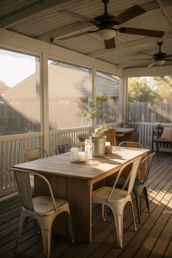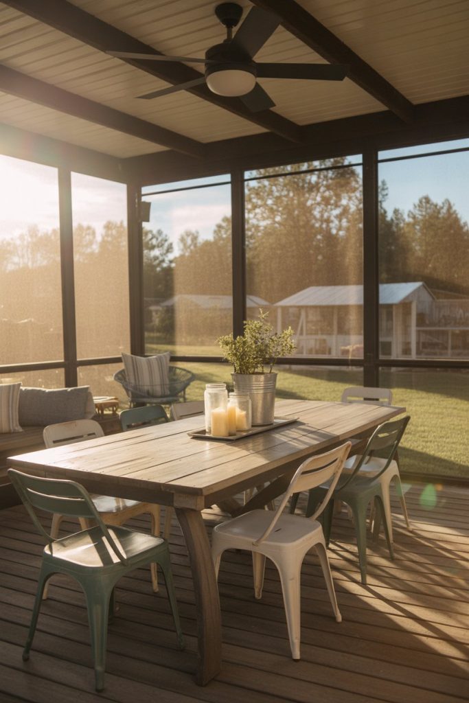 A screened in patio offers the best of both worlds—fresh air without the bugs. Anchor the space with a reclaimed wood dining table, mismatched chairs for character, and an overhead ceiling fan for air circulation. Incorporate farmhouse details like galvanized planters, mason jar candle holders, and a vintage market sign. This style resonates across the Midwest and South, where outdoor dining extends well into fall.