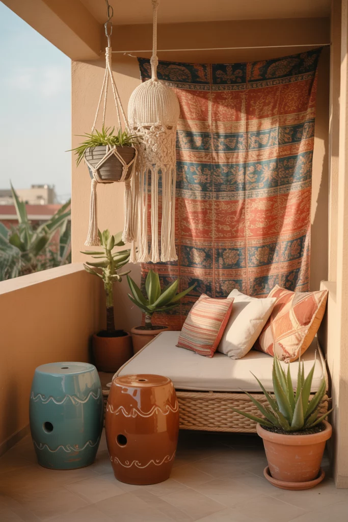 Hang a weather-resistant tapestry or outdoor curtain panel to create a bohemian focal wall on an otherwise plain patio. Pair it with colorful ceramic stools, macramé plant hangers, and a low-slung daybed piled with pillows. This design approach works especially well on apartment balconies where you need vertical interest without drilling into building exteriors. Choose fade-resistant fabrics treated for UV protection to maintain vibrancy through multiple seasons.