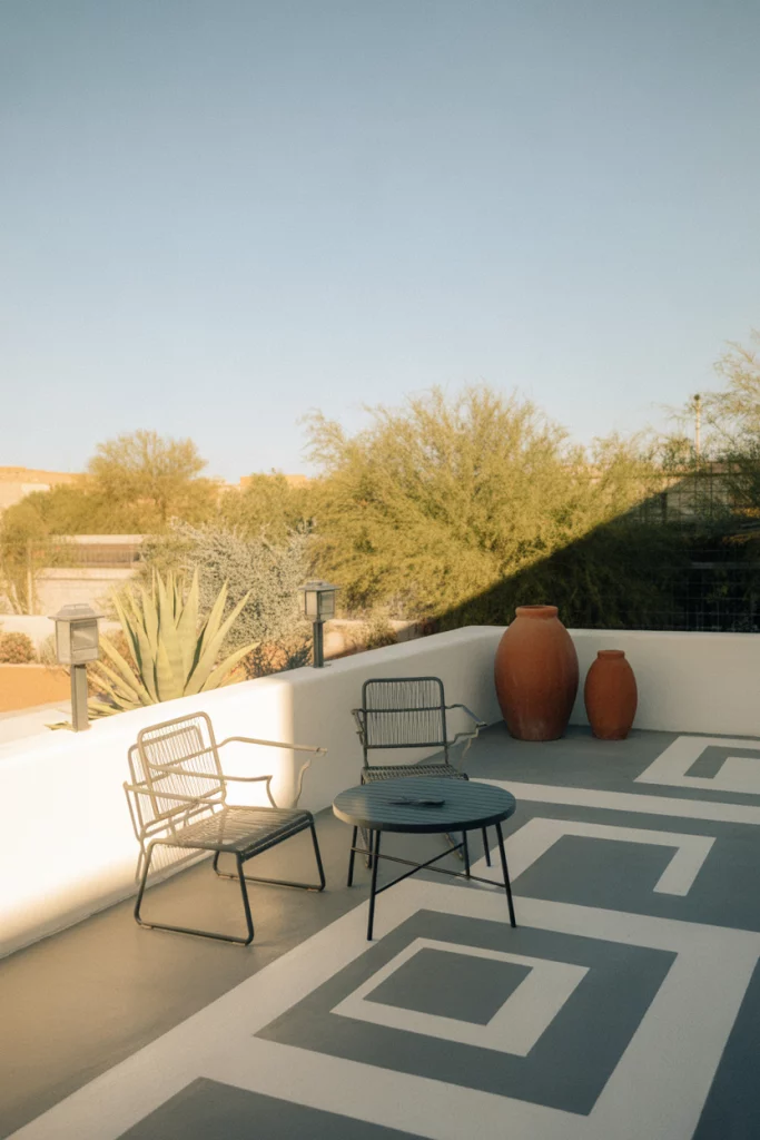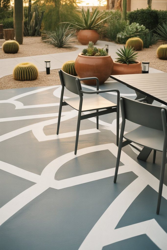 Turn a bare concrete patio into a design statement by painting it with outdoor floor paint in geometric patterns or faux tile designs. Add outdoor furniture with clean lines, a few oversized planters, and solar pathway lights along the perimeter. This budget-friendly upgrade breathes life into builder-grade patios common in suburban developments across Arizona, Nevada, and Southern California.