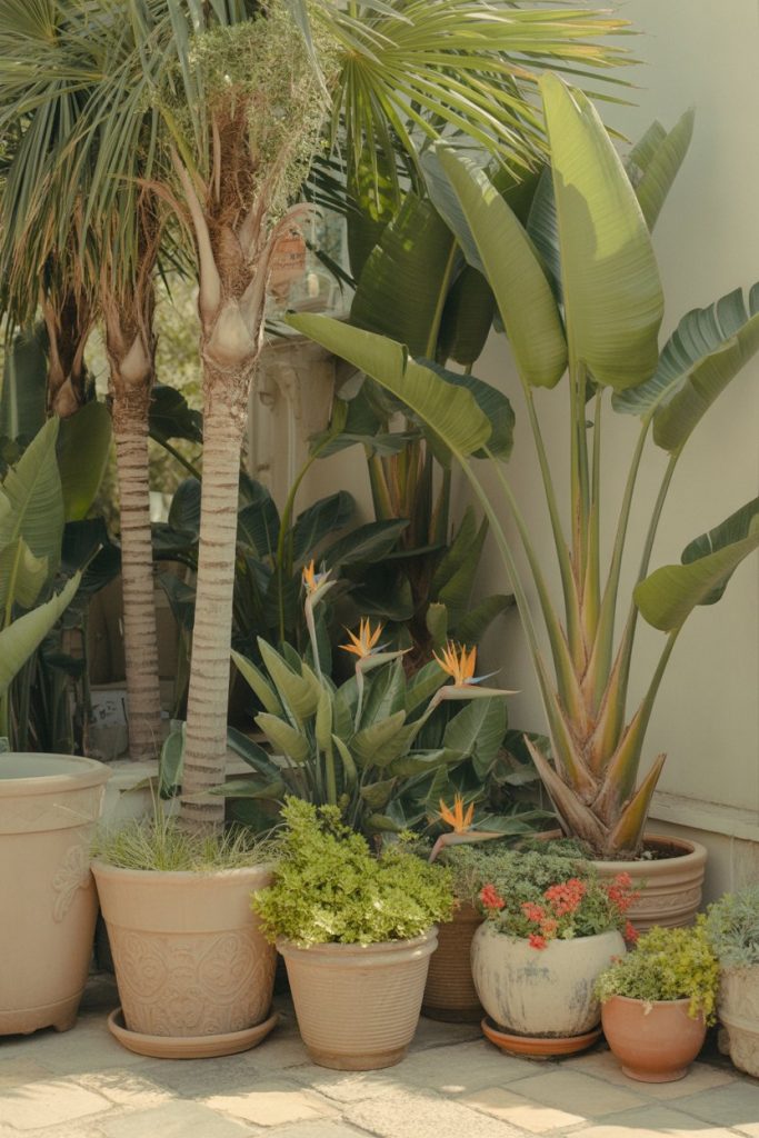 Bring tropical vibes to non-tropical climates by clustering container-grown palms, elephant ears, and bird of paradise around your patio perimeter. Use plants in varying heights and textures, and underplant with coleus or caladiums for pops of color. This approach thrives on backyard patios with southern or western exposure, where heat-loving species receive adequate sunlight without scorching.