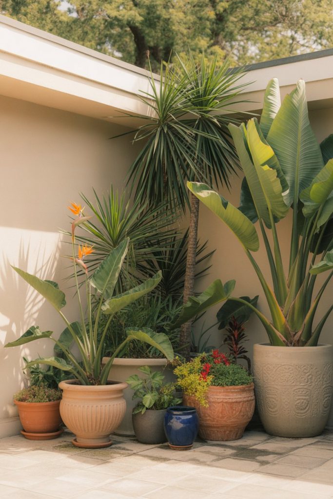 American lifestyle context: In Midwestern and Northeastern states, these tropical containers move indoors for winter, serving double duty as houseplants. Choose wheeled plant caddies for easier seasonal transitions, and select hardy varieties like parlor palm or ZZ plant that tolerate indoor conditions. This flexibility appeals to renters and homeowners who want bold style without permanent landscaping commitments.