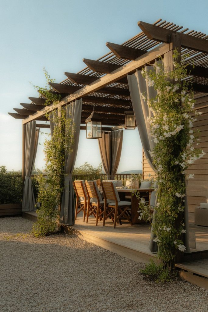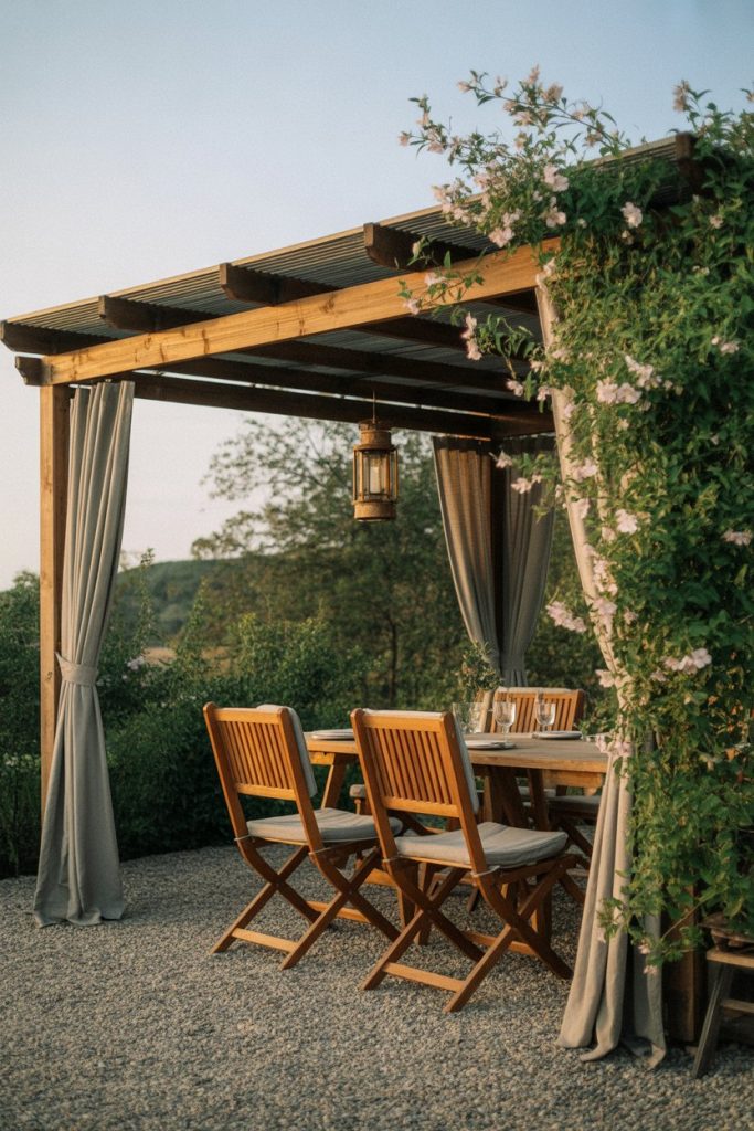 A rustic cedar or pine pergola provides architectural structure while supporting climbing plants like clematis, honeysuckle, or jasmine. Install outdoor curtains on side panels for adjustable shade and privacy. This design works beautifully on large patios where you need to define separate zones for dining, lounging, and conversation without building permanent walls.