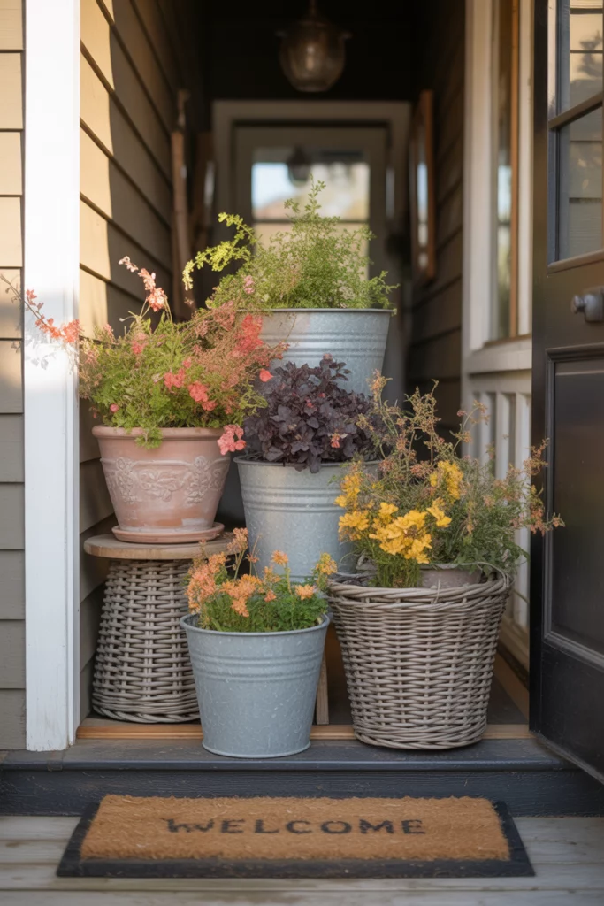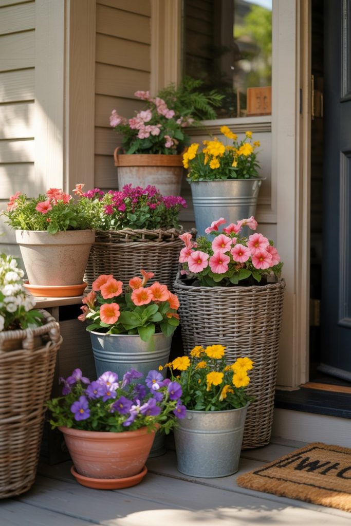 Elevate your front porch with asymmetrical groupings of planters in varying heights, materials, and textures. Mix galvanized metal, glazed ceramic, and natural fiber baskets for visual interest. Plant seasonal blooms like petunias in spring, zinnias in summer, and ornamental kale in fall. This approach works on narrow apartment cheap porches where space is tight but curb appeal matters.