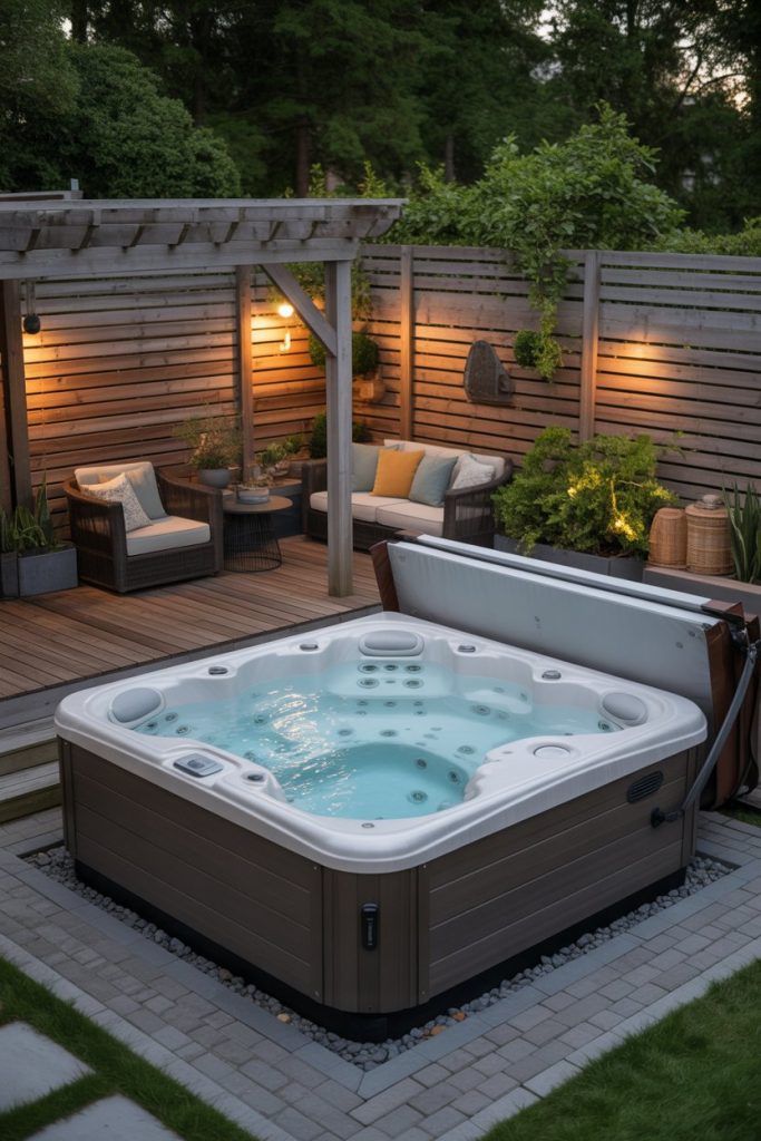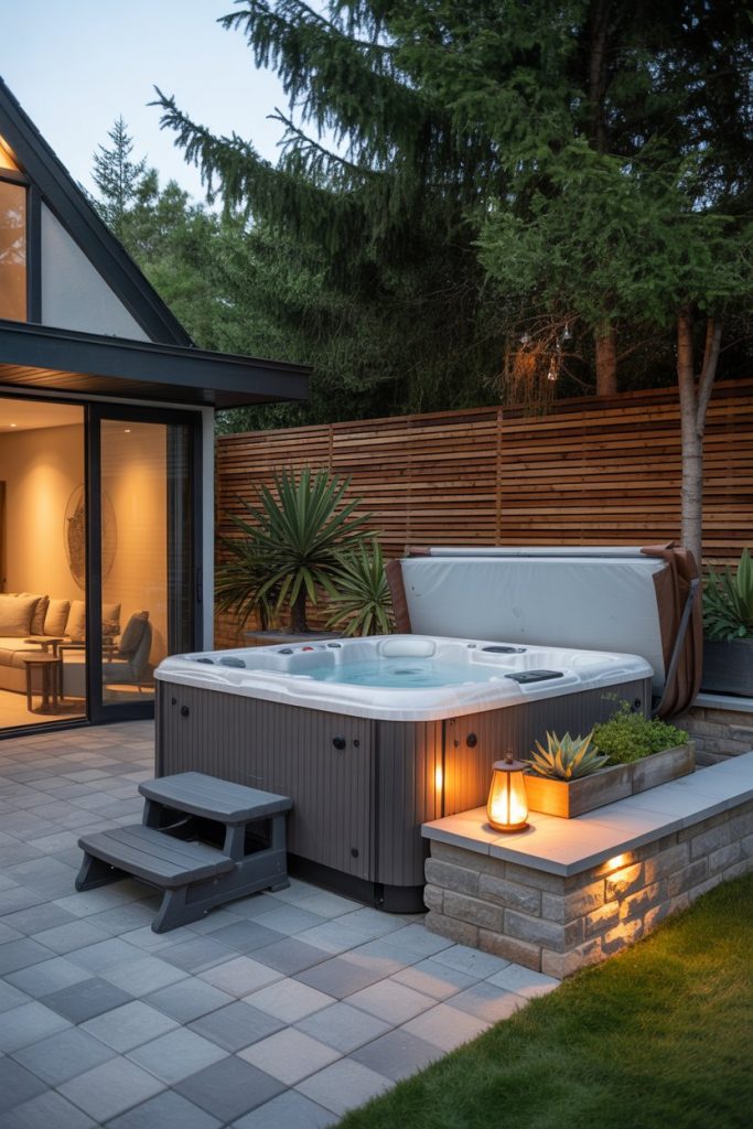 An outdoor hot tub area creates a cozy year-round retreat, especially when integrated into a backyard or covered patio for added privacy. Many homeowners pair hot tubs with stone paths, paver decks, or backyard concrete pads for a stable and attractive base. This idea blends relaxation with smart layout choices, ensuring access, lighting, and safety. Designers note that hot-tub patios feel like mini spa escapes that encourage slow evenings and weekend unwinding.