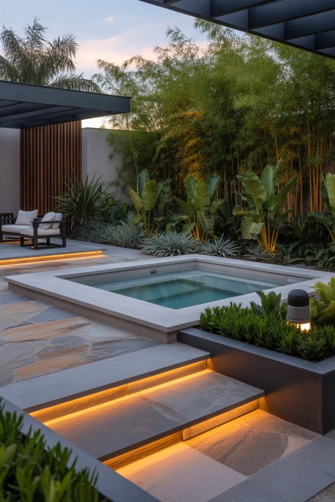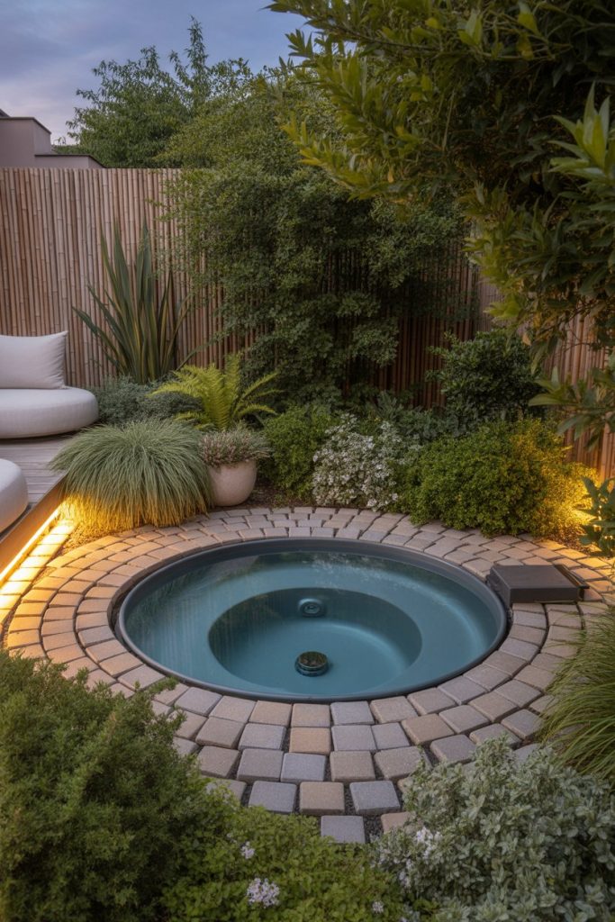 Positioning an outdoor hot tub area within a partially enclosed garden nook creates an atmosphere of privacy and calm. Homeowners often use paver or stone bases combined with soft landscaping to shape a relaxing layout. This idea suits both small backyard spaces and larger retreat-style patios. Designers highlight how thoughtful screening—plants, slatted walls, or pergolas—makes the hot tub feel integrated rather than added on.