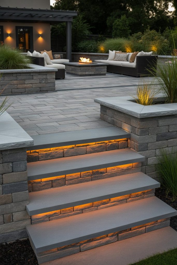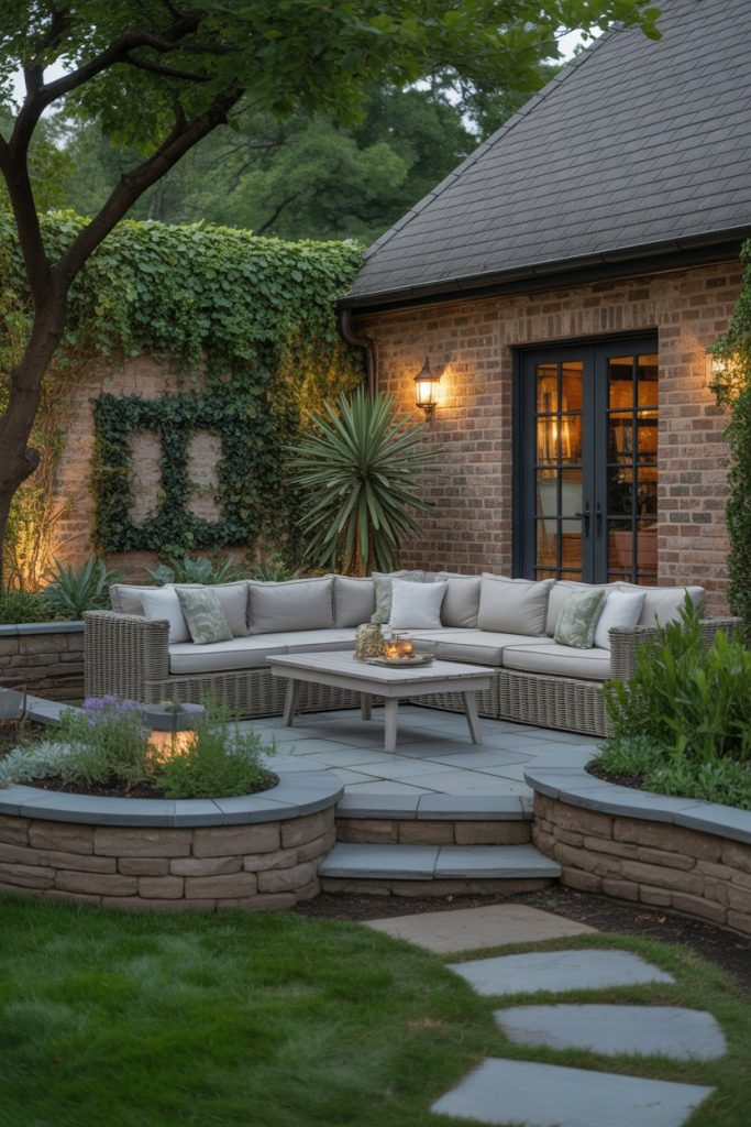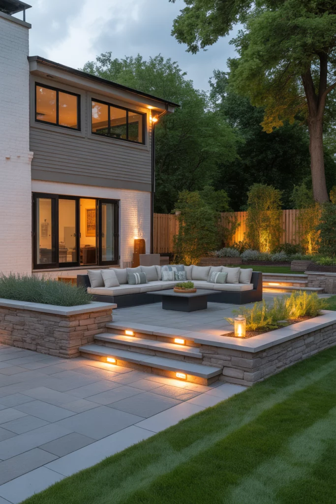 Split-level patios are becoming popular because they help organize a backyard, especially when blending stone, paver, or concrete materials into a tiered layout. This idea works for both small backyard areas and larger spaces where each level feels like its own room. Many homeowners use one tier for dining, another for lounging, and a lower one as an outdoor hot tub area or fire feature. Designers appreciate how split levels add movement and depth, similar to restaurant terraces with gradual transitions that soften long expanses of hardscape.