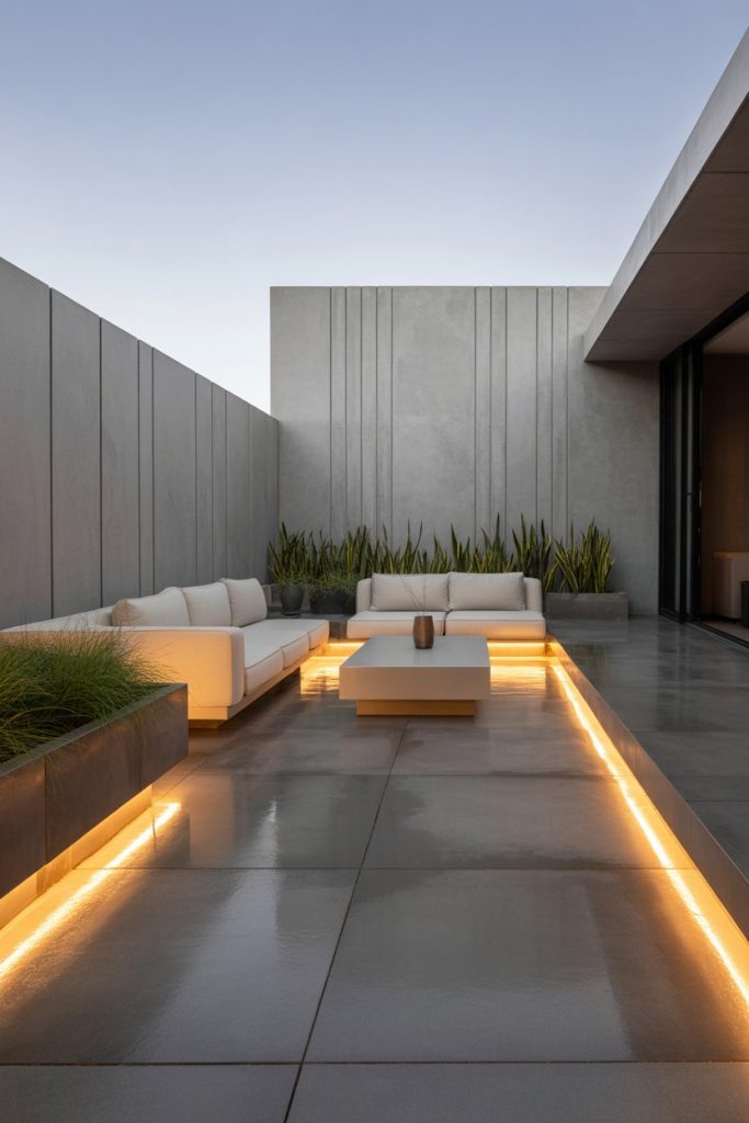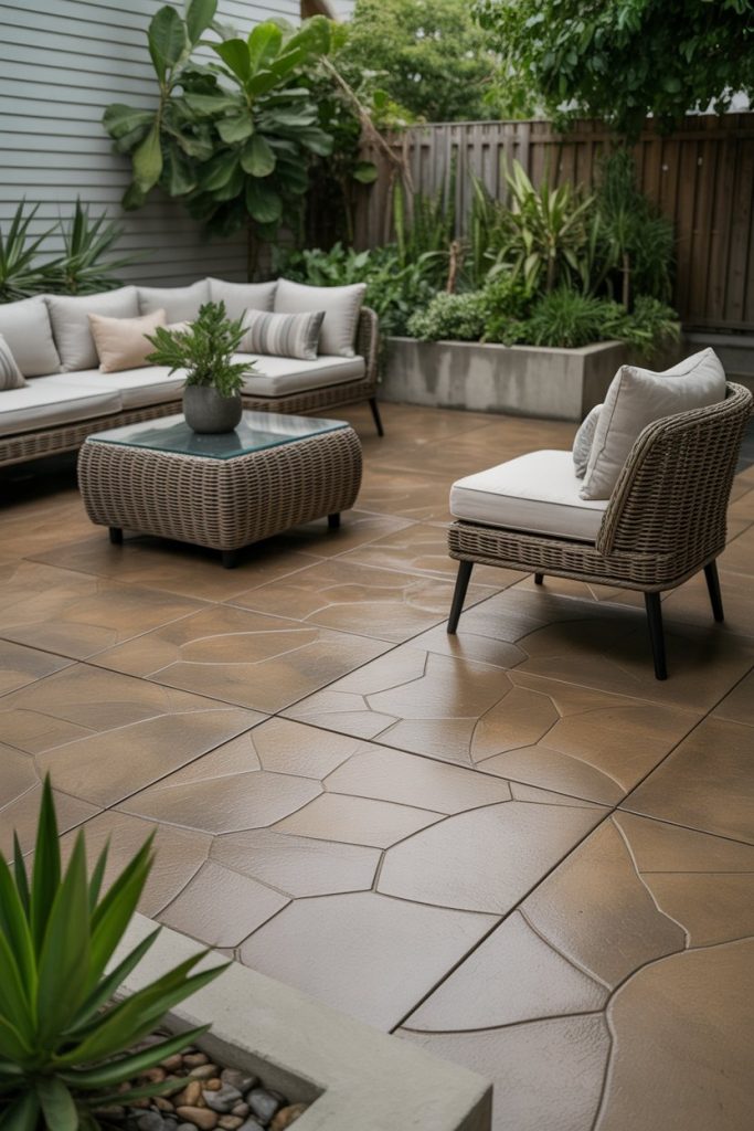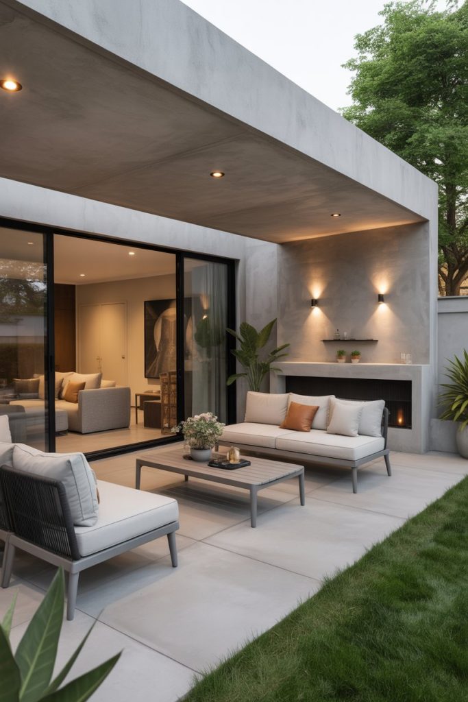 A minimalist patio anchored by smooth concrete is ideal for homeowners who prefer a clean, modern look while keeping maintenance low. This approach suits backyard concrete upgrades in both front and back spaces, especially when paired with a simple layout and streamlined furnishings. Even in a small backyard, the smooth finish makes the area feel more open. Many designers compare this trend to upscale restaurant courtyards that rely on negative space and restrained color palettes for a calming outdoor experience.