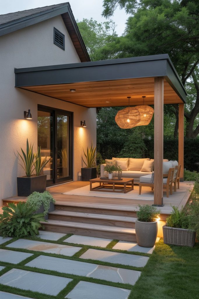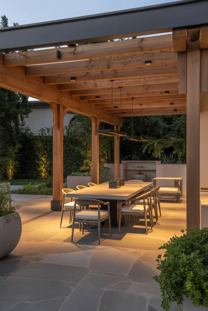 A covered dining patio elevates everyday meals, turning an ordinary backyard into a luxury hospitality-style retreat. Using mixed materials like stone, flagstone, and warm wood beams, this design resembles modern restaurant dining environments. Homeowners often pair it with accent lighting and greenery for a layered feel. Even small backyard spaces benefit from thoughtful ideas and layout planning, especially when the dining zone becomes the visual anchor for the entire outdoor experience.
