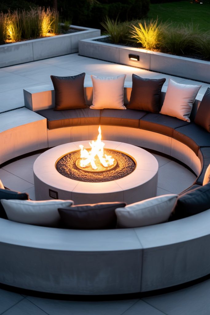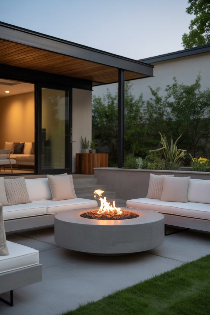 A backyard concrete fire lounge blends comfort with durability, making it ideal for families who spend evenings outside. This modern idea uses smooth concrete, stone, or paver seating zones arranged in a warm circular layout. Designers say the combination of fire, concrete, and soft cushions creates a social hub similar to trendy restaurant patios. Even small backyard spaces feel elevated when the fire feature becomes the centerpiece, encouraging long conversations and relaxed weekends.