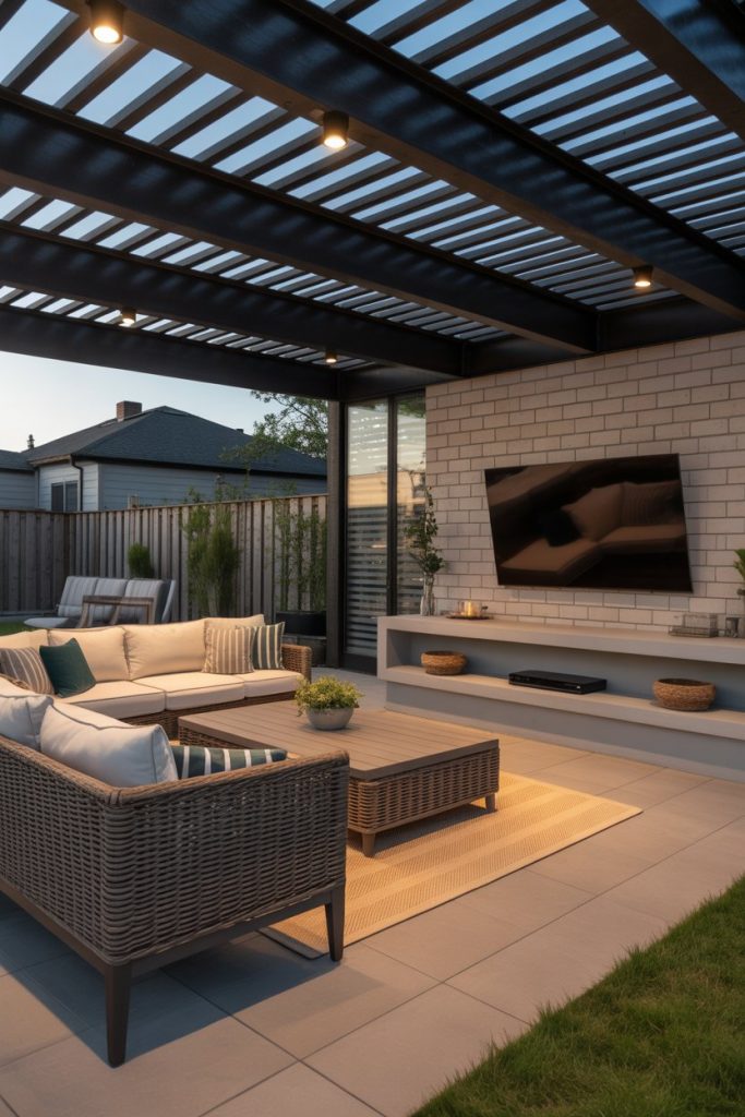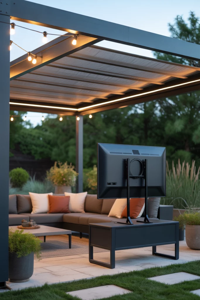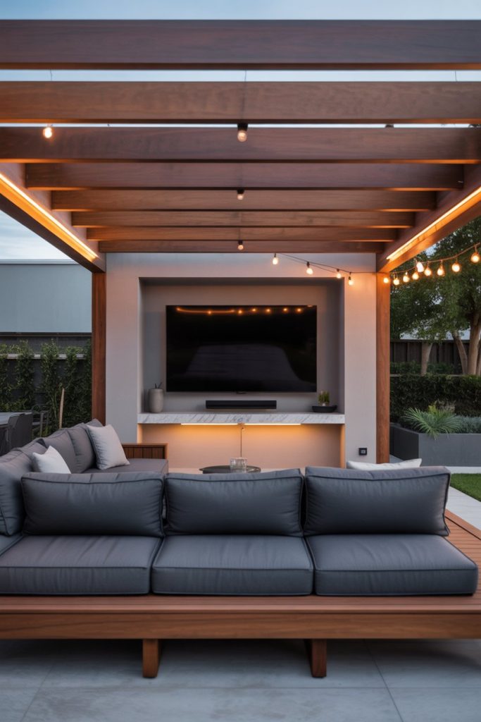 A pergola paired with an outdoor TV ideas corner blends shade, entertainment, and structure into one polished feature. The design fits small backyard patios or larger family back areas where homeowners want a dedicated media zone. The shade helps reduce glare, while the pergola’s beams create architectural interest. This approach echoes resort-style lounges and high-end restaurant terraces that mix technology and comfort gracefully.