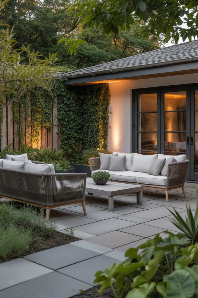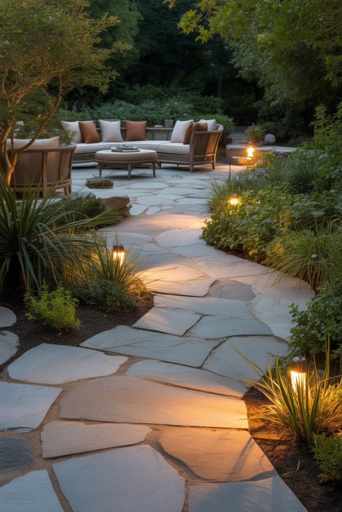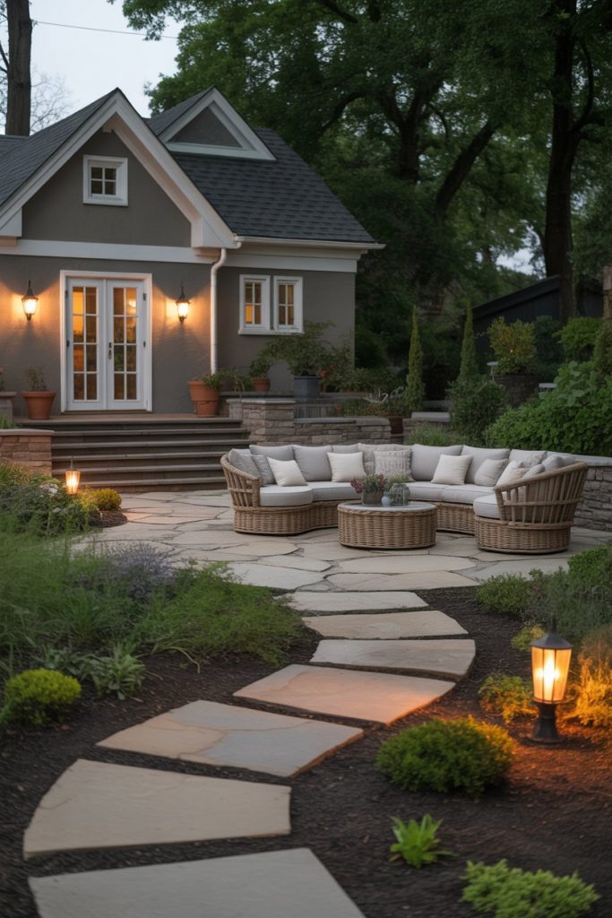 Blending flagstone with warm wood elements creates a tactile, modern patio that feels grounded and inviting. This hybrid style fits into backyard or front homes where homeowners want organic textures without a heavy look. Designers often mix flagstone paths, wood benches, and soft planting to achieve a layered layout similar to boutique restaurant courtyards. It’s especially effective in climates where stone helps cool the patio during hot months.