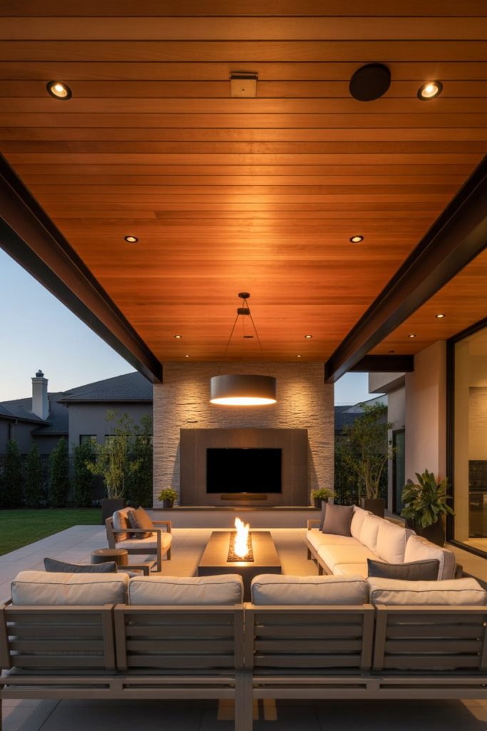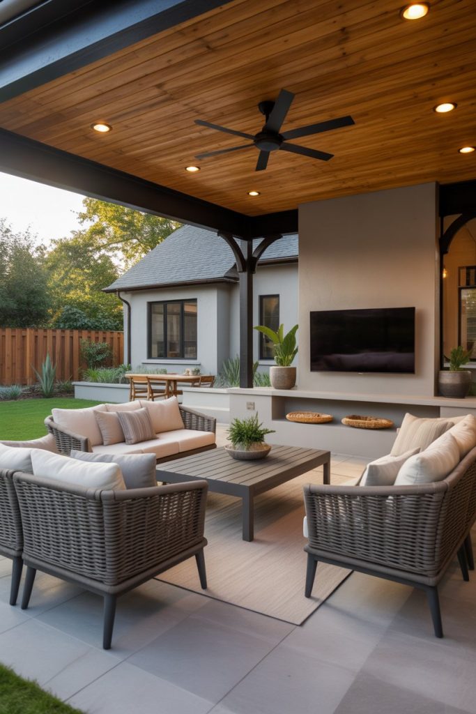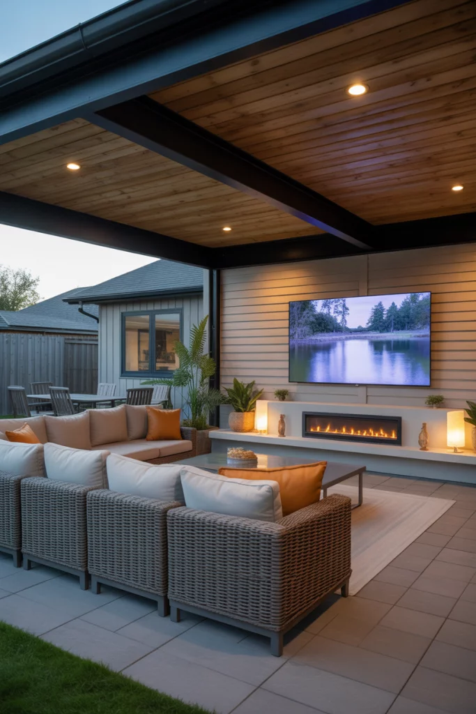 An outdoor TV setup transforms any backyard or covered patio into a year-round entertainment zone. Homeowners love this approach because it blends leisure with functionality, especially when paired with weather-resistant furniture and defined layout zones. It works well in both small backyard spaces and larger outdoor areas as long as lighting and cable routing are planned well. Many decorators highlight how creating a movie-night corner feels like adding a bonus room without building an addition.