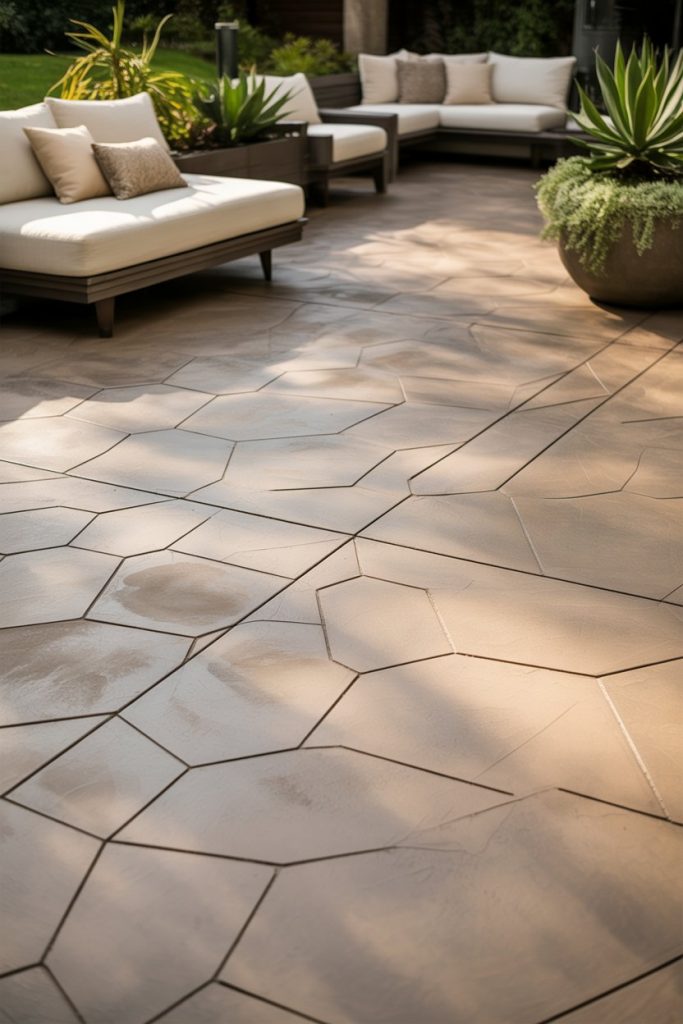 Stamped concrete is popular in backyard concrete patios due to its durability and wide aesthetic versatility. It is used to imitate rock, brick, or wood finishes, all at a lower cost than natural materials. It is a suitable choice for modern-looking back entertaining spaces or front entry patios with low upkeep. Houzz designers comment on its versatility for most ideas, layout planning, and additions in climates affected by freeze-thaw materials. It is also practical for family-friendly outdoor spaces.