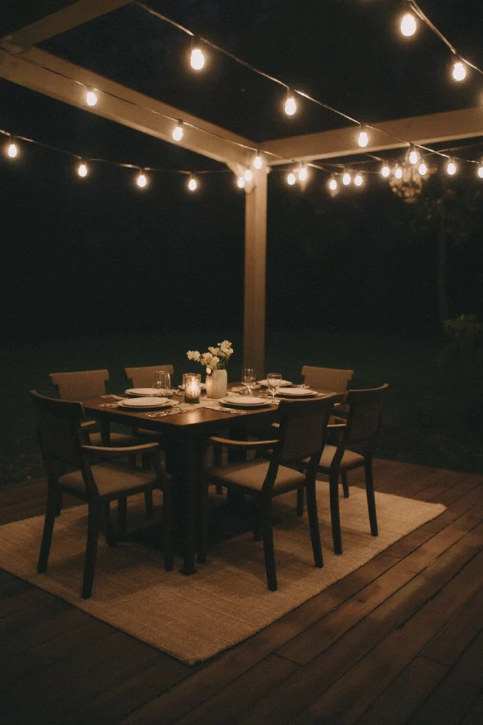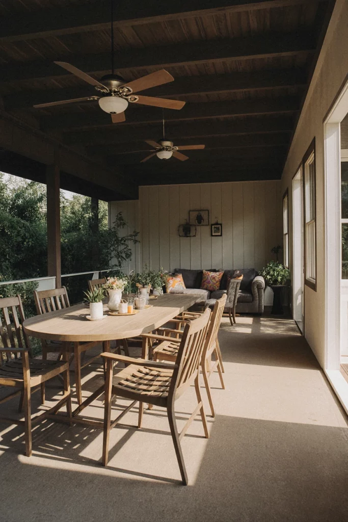 A covered back porch creates the perfect outdoor dining zone for families. Adding a weatherproof table, simple lighting, and a rug makes even a small back space functional. A friend invites neighbors over weekly for casual meals on her back porch—it’s become a warm neighborhood ritual.