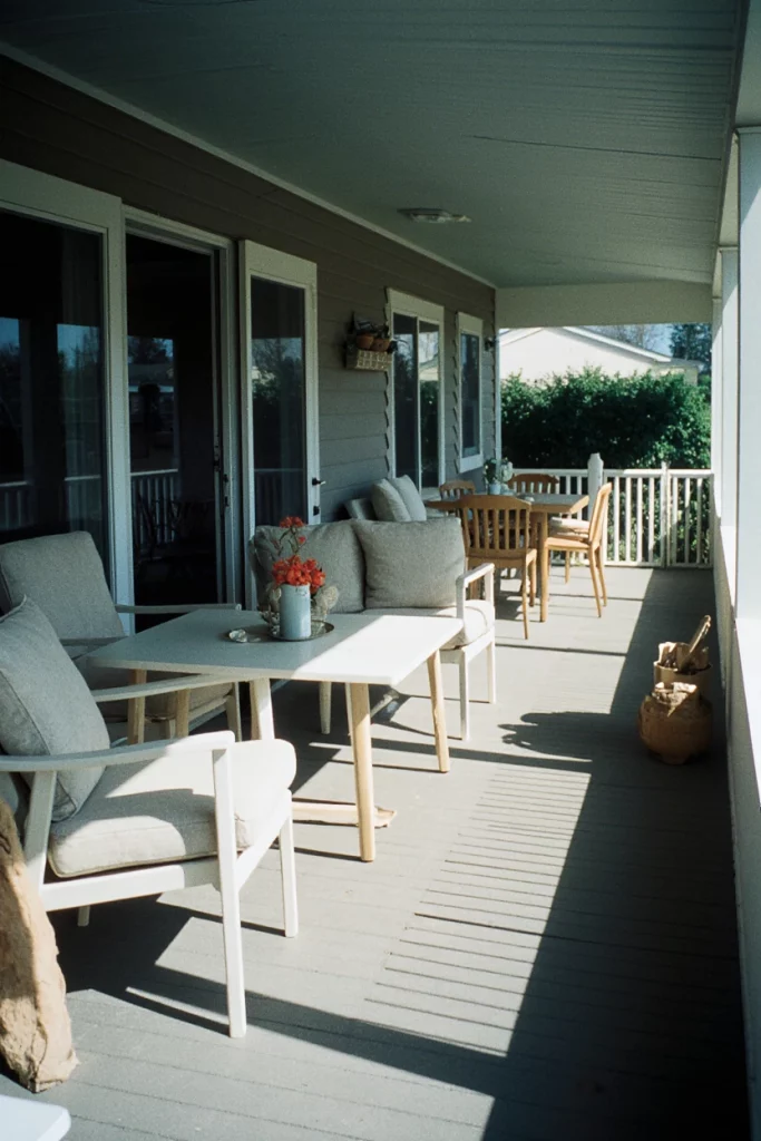 A double-wide front porch offers generous room for hosting, dining, or simply relaxing. These spaces shine in manufactured home neighborhoods where outdoor gatherings are common. I’ve attended birthday parties on porches like this, and the open-air setting always makes conversation easier and more enjoyable.