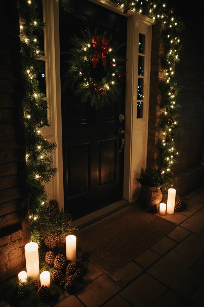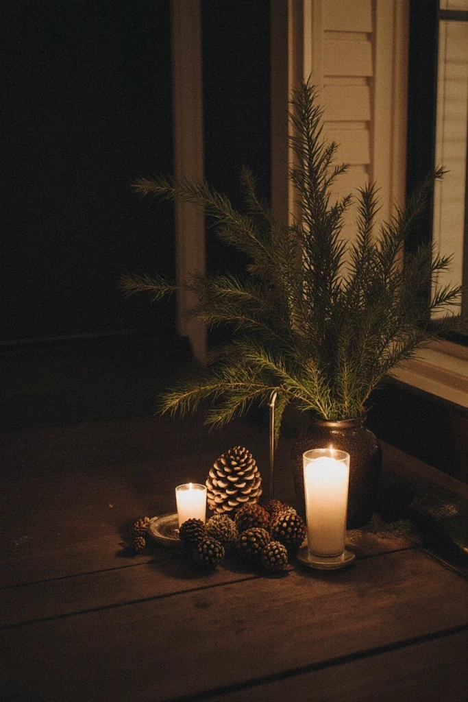 A Christmas porch filled with natural accents—pinecones, branches, and candles—feels stylish and warm. Even simple touches can elevate a front or tiny front entry. Growing up, our family used natural decorations, and they always felt more heartfelt than store-bought pieces.