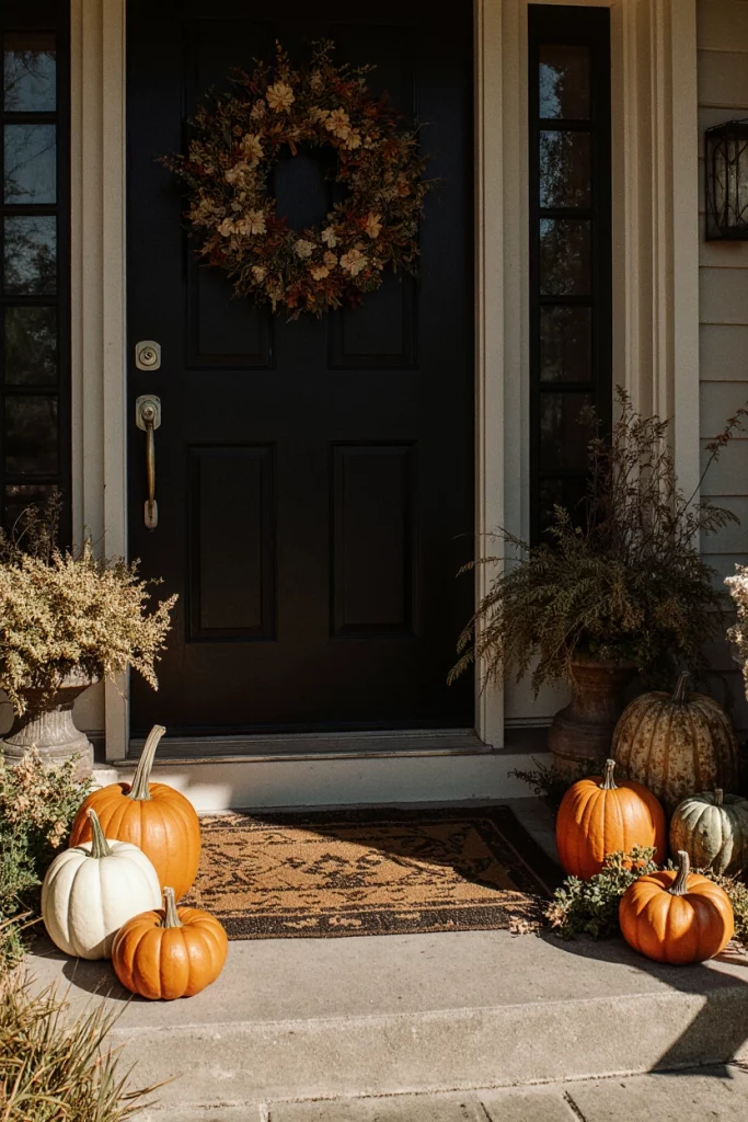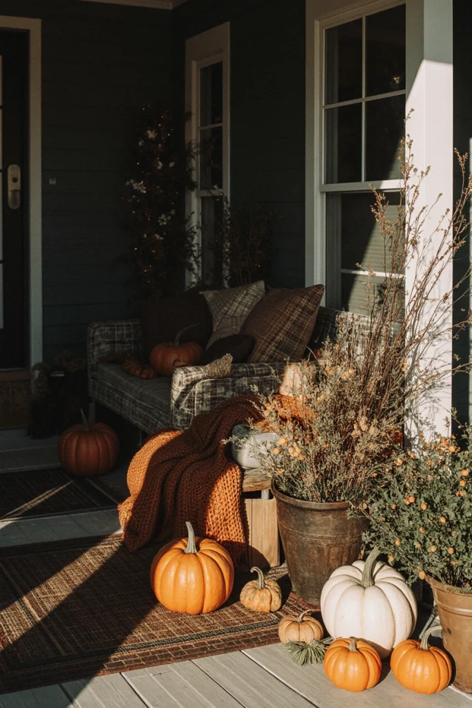 A simple fall front porch focuses on seasonal touches using pumpkins, dried florals, and warm fabrics. Both front and backyard entries benefit from this cozy, easy-to-maintain approach. A neighbor once told me she spends very little but still gets compliments every autumn, showing how small, natural accents can have a big impact.