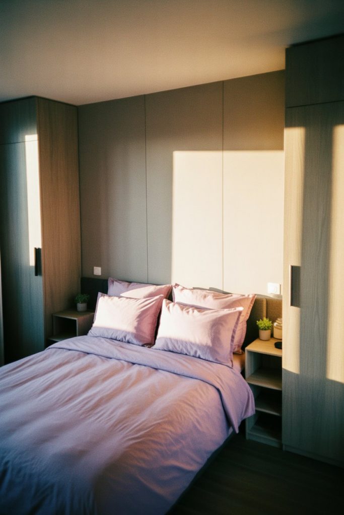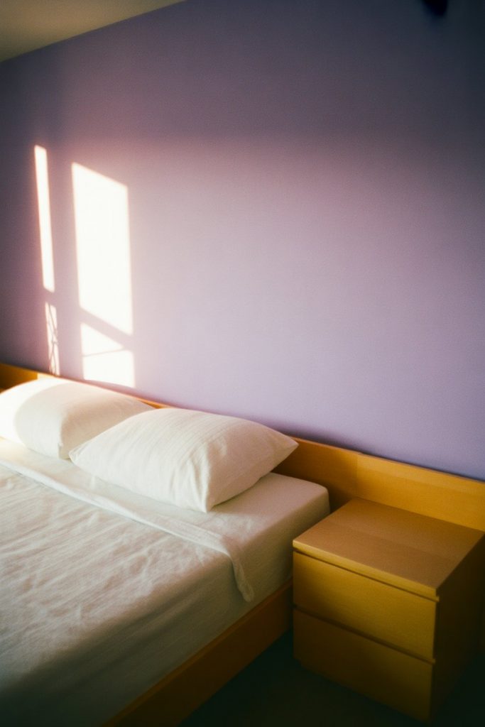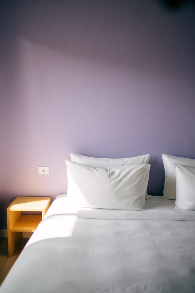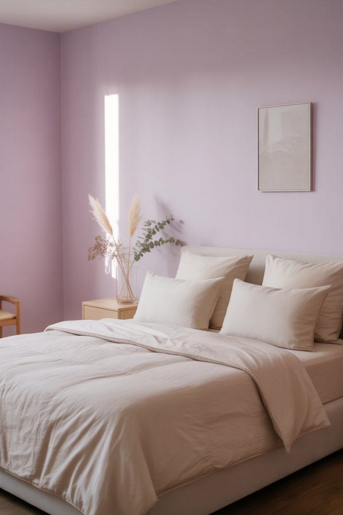 A light lavender wall paired with crisp white and linens creates a serene, minimalist bedroom that feels open and calming. This look works beautifully in smaller spaces where you want to maintain airiness while introducing color. The pastel purple tone softens the starkness of all-white rooms without overwhelming the senses, making it ideal for anyone who craves simplicity with a touch of personality. Consider adding natural wood accents to warm up the palette.