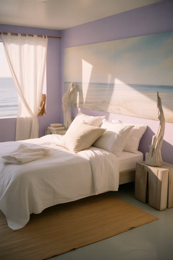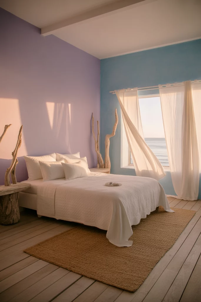 Combine soft lavender with pale blue and white for a bedroom that evokes coastal tranquility. This palette feels breezy and open, ideal for anyone who dreams of seaside living or just wants a space that promotes relaxation. The purple adds a gentle warmth that keeps the blue from feeling too cold, while white keeps everything bright and airy. Natural fiber rugs and driftwood accents complete the look.