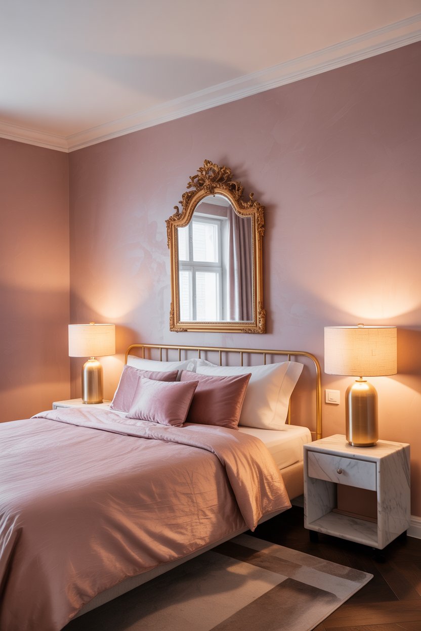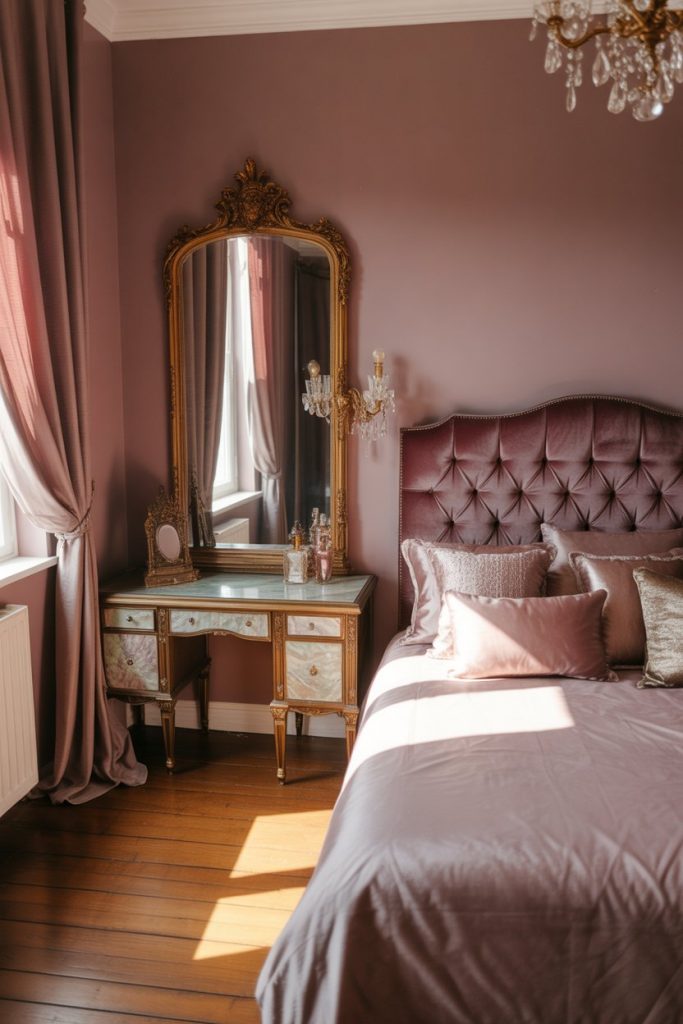 Channel Old Hollywood with a mauve purple paired with antique gold accents and velvet textures. This look is unabashedly romantic and glamorous, perfect for anyone who appreciates vintage aesthetics with a luxurious edge. Think tufted headboards, ornate mirrors, and crystal lighting fixtures. The muted purple keeps it from feeling too over-the-top while the gold adds just enough sparkle.