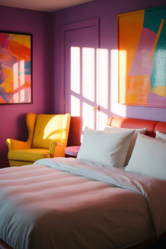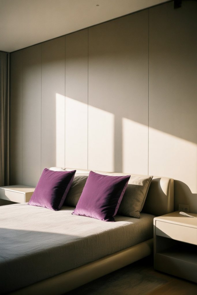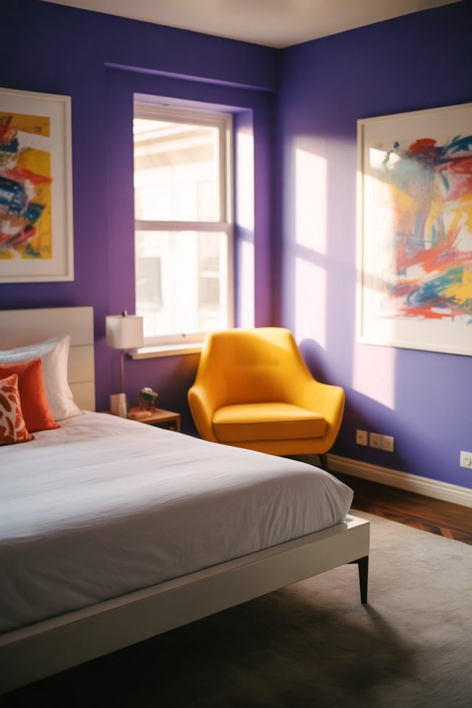 For those who love color and aren’t afraid to experiment, pairing purple with pops of yellow and white creates an energetic, unexpected bedroom. This combination is cheerful without being juvenile, bold without being chaotic. Use yellow sparingly—in throw pillows, artwork, or a single accent chair—to punctuate the purple without competing with it. The high contrast keeps the space feeling lively and modern.