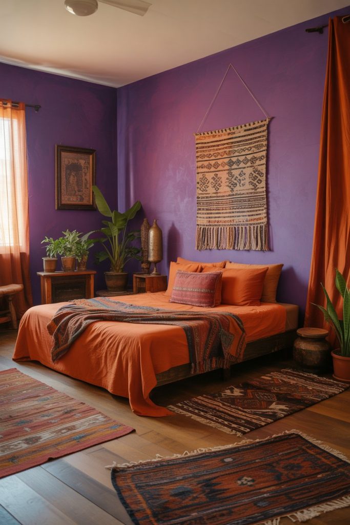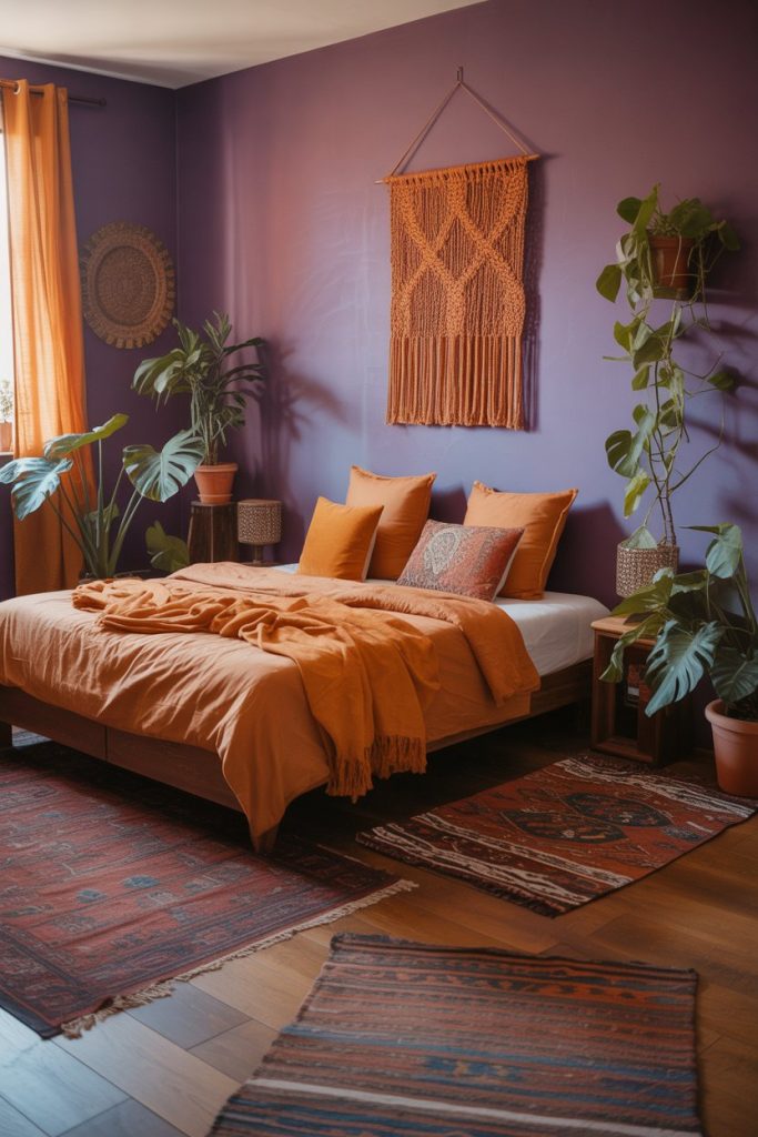 Embrace bohemian style with deep purple walls accented by burnt orange and terra-cotta tones. This warm, earthy combination feels grounded and creative, perfect for artistic souls who want a bedroom that reflects their free-spirited nature. Layer in woven textiles, macramé wall hangings, and potted plants to complete the boho aesthetic. The richness of purple provides depth while orange adds unexpected vibrancy.