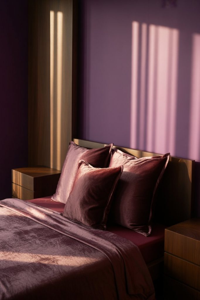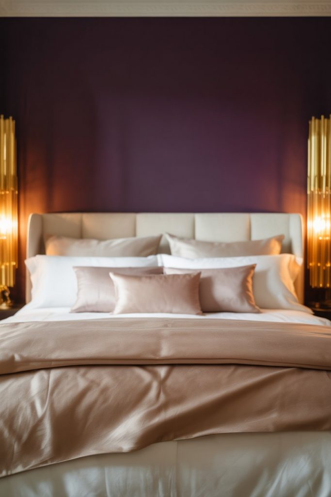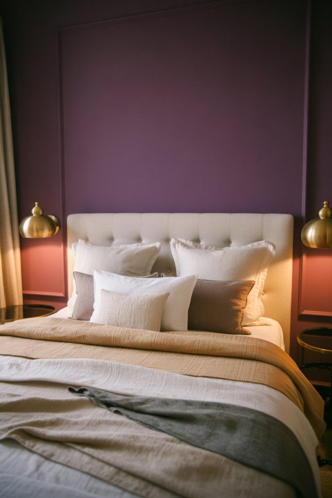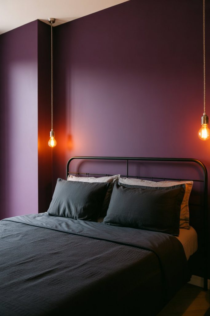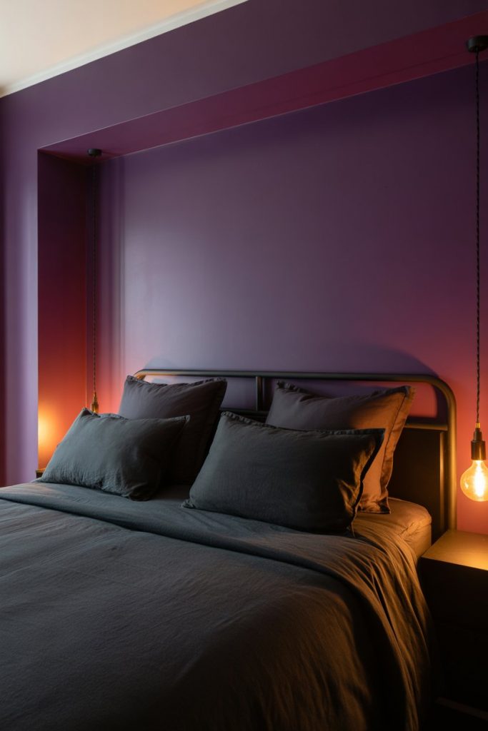A single dark plum accent wall behind the bed anchors the room with bold sophistication. This technique works especially well in master bedrooms where you want to create a focal point without committing to an entirely moody space. The richness of plum adds depth and warmth, especially when paired with metallic gold or brass fixtures that catch the light. It’s a confident choice that signals maturity and taste.