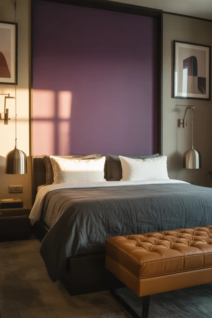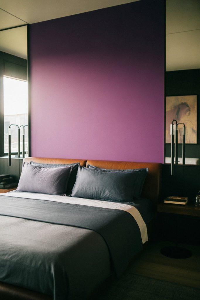 Pair vibrant violet with charcoal gray or gunmetal accents for a bedroom with serious modern edge. This combination feels current and sophisticated, perfect for urban lofts or contemporary homes. The dark gray grounds the brightness of violet, preventing it from feeling too whimsical or juvenile. Metal fixtures, leather accents, and abstract artwork complete the contemporary aesthetic.