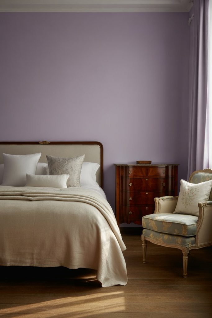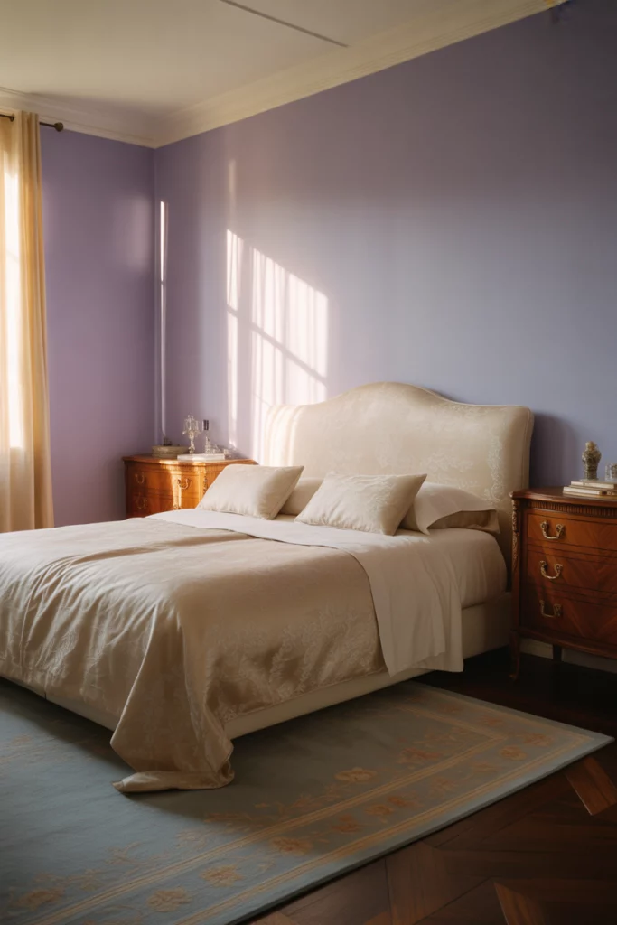 Achieve timeless elegance by pairing soft purple walls with cream bedding and furniture. This classic combination feels refined without being stuffy, romantic without being overly feminine. The warmth of cream softens purple’s cool undertones, creating a balanced, inviting space. This is a safe but stylish choice for anyone who wants color without risk of it feeling dated in a few years.
