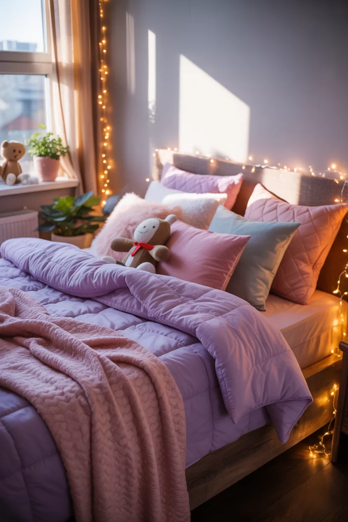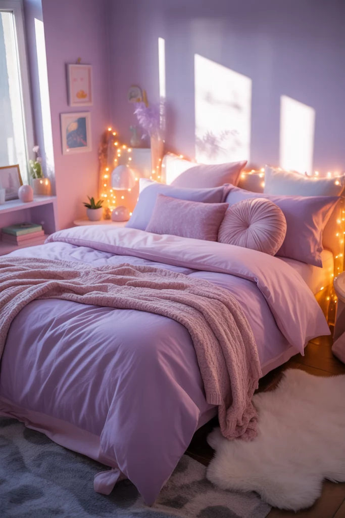 Create a cute and playful bedroom by mixing various shades of purple with soft pink and blush tones. This sweet combination feels youthful and charming without being overly childish, making it versatile for teens, young adults, or anyone who loves a feminine aesthetic. Layer different textures—velvet, linen, cotton—to add depth and interest. Small decorative touches like fairy lights or pom-pom trim complete the adorable vibe.