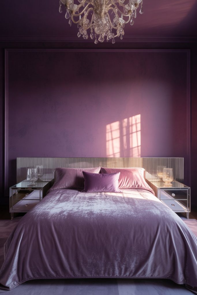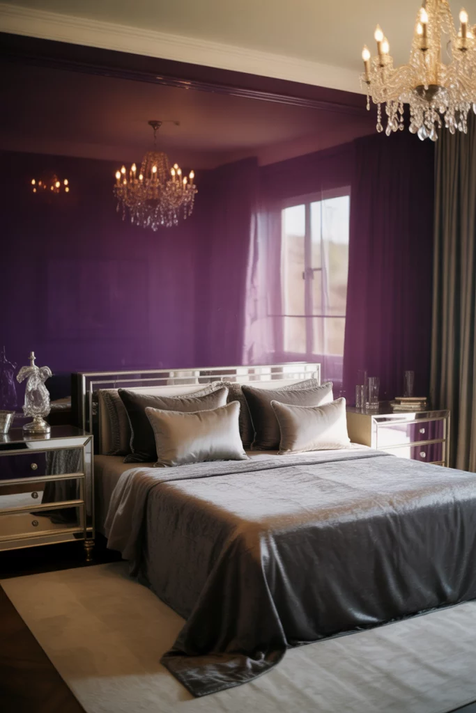 Finish strong with a luxurious amethyst purple paired with silver metallic accents for maximum glamour. This jewel-toned approach feels opulent and special, transforming your bedroom into a retreat worthy of a boutique hotel. Mirrored furniture, crystal lighting, and plush velvet textiles enhance the luxe factor. It’s bold, beautiful, and makes no apologies for celebrating color and shine.