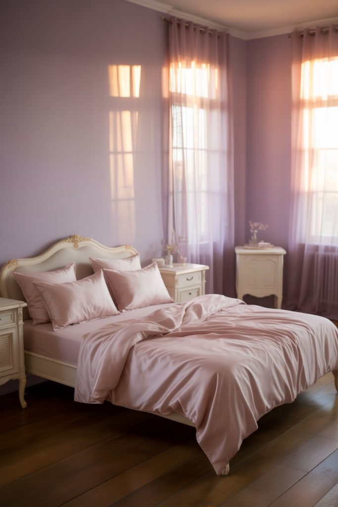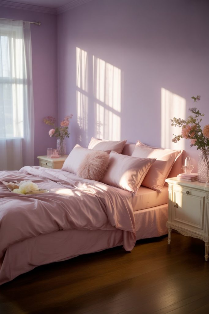For a romantic and whimsical bedroom, blend lilac with blush pink and soft whites. This combination feels playful without being overly childish, making it perfect for young adults or anyone who wants to embrace a softer, more feminine aesthetic. The two-tone approach adds visual interest while maintaining a cohesive, dreamy quality. Layer in velvet or satin textures to enhance the luxurious feel.