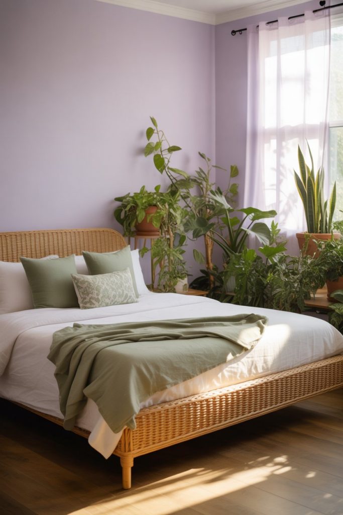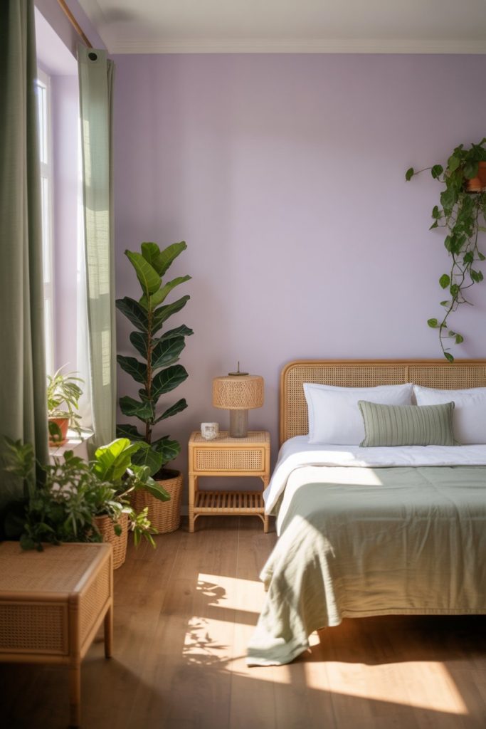 Bring nature indoors by combining soft lavender with sage green and natural wood tones. This pairing feels fresh and rejuvenating, reminiscent of spring gardens and openmeadows. The light purple provides a delicate backdrop while green accents—through plants, textiles, or artwork—ground the space in organic warmth. It’s a wonderful choice for anyone who finds peace in botanical elements.