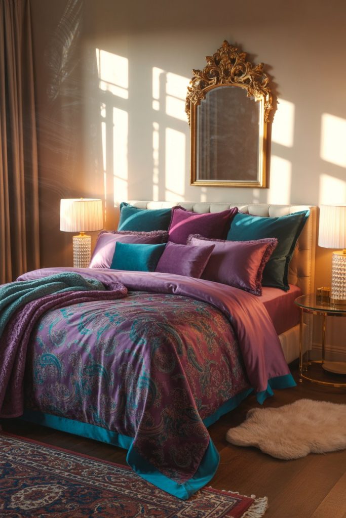Jewel tones are back in a big way, and pairing purple with teal and gold creates a bedroom that feels rich and globally inspired. Think Moroccan riads or Indian textiles—spaces where color is celebrated rather than minimized. This combination works beautifully with intricate patterns, layered textiles, and metallic accents. It’s bold, but when done right, it’s also deeply inviting.