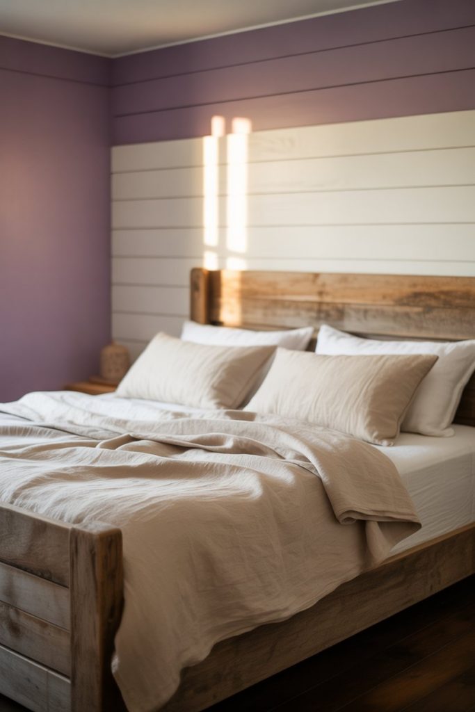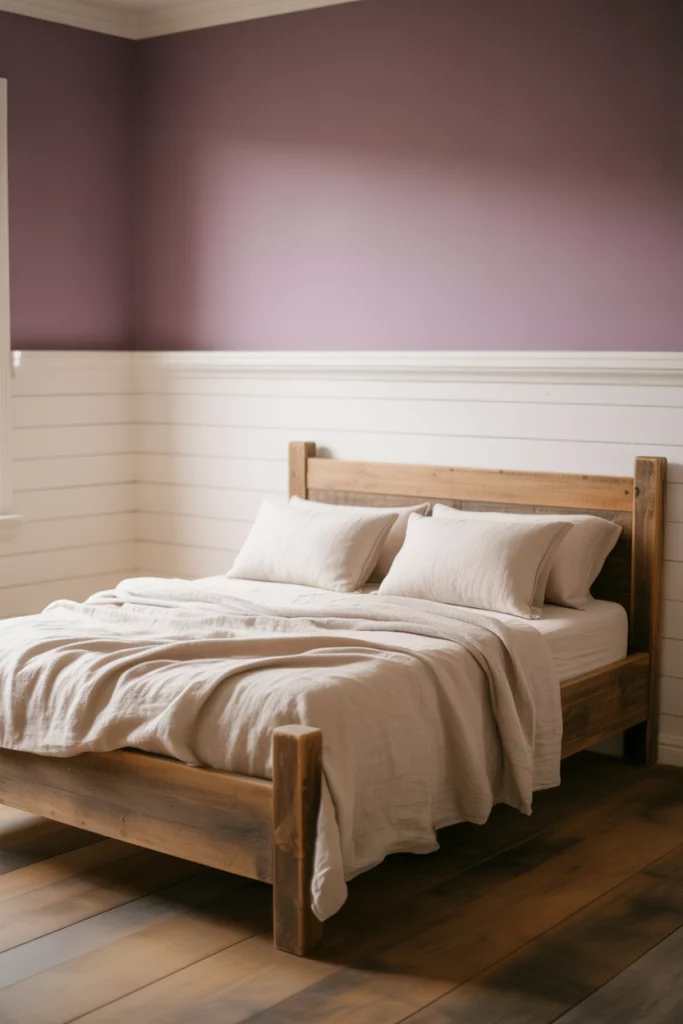 A dusty purple—somewhere between mauve and lilac—paired with weathered white and wood brings farmhouse charm with a modern twist. This look is especially appealing in rural or suburban settings where rustic elements feel authentic rather than forced. Distressed furniture, linen bedding, and vintage-style lighting complete the vibe. It’s cozy without being cluttered, sophisticated without being stuffy.