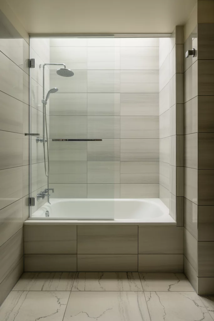 A tub with a shower walk glass enclosure is a modern combination that offers showering flexibility. It saves space and adds a touch of luxury. To achieve timeless design, use neutral tones for tiles with chrome or vintage brass for the fixtures. This design is ideal for apartments or condos with limited space yet comfort is required.