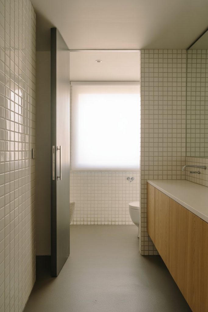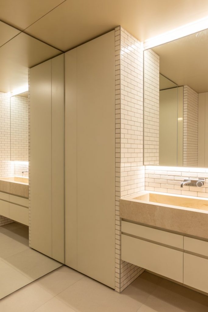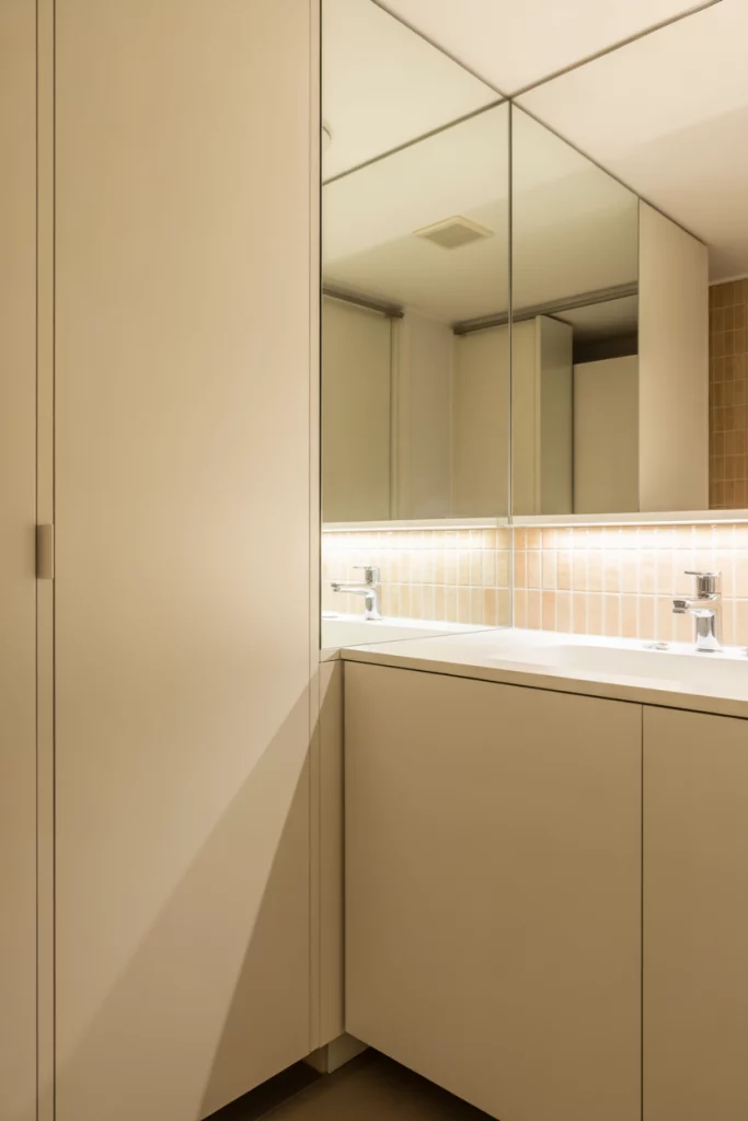 For a truly efficient layout, use built-in mirrors that double as storage and floor-to-ceiling cabinetry for extra organization. Soft tones or modern white finishes expand the visual space. A super slim sink and compact fixtures make the design neat and functional. Perfect for small apartments or minimalist fans.
