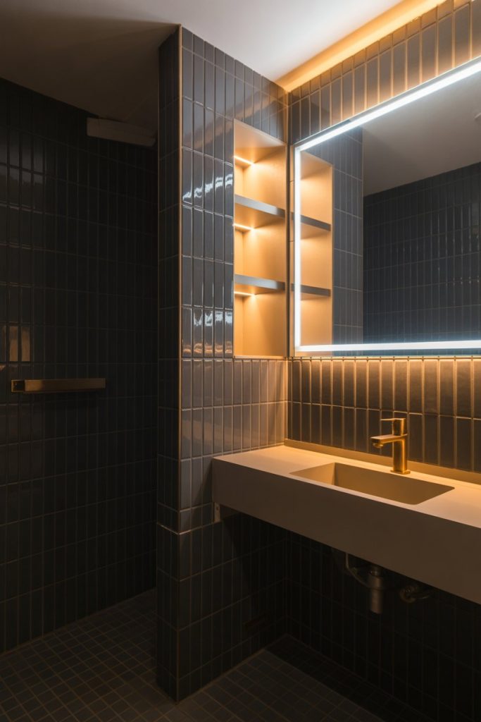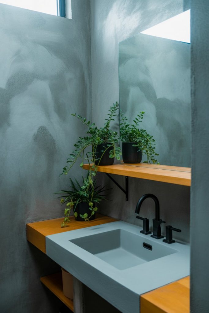 An industrial-chic bathroom uses concrete walls, black steel shelves, and exposed bulbs. The dark surfaces bestow a raw, edgy modern character. Balance with green plants or wood textures for warmth. This is great for loft-style apartments or for those seeking a bold statement without clutter.