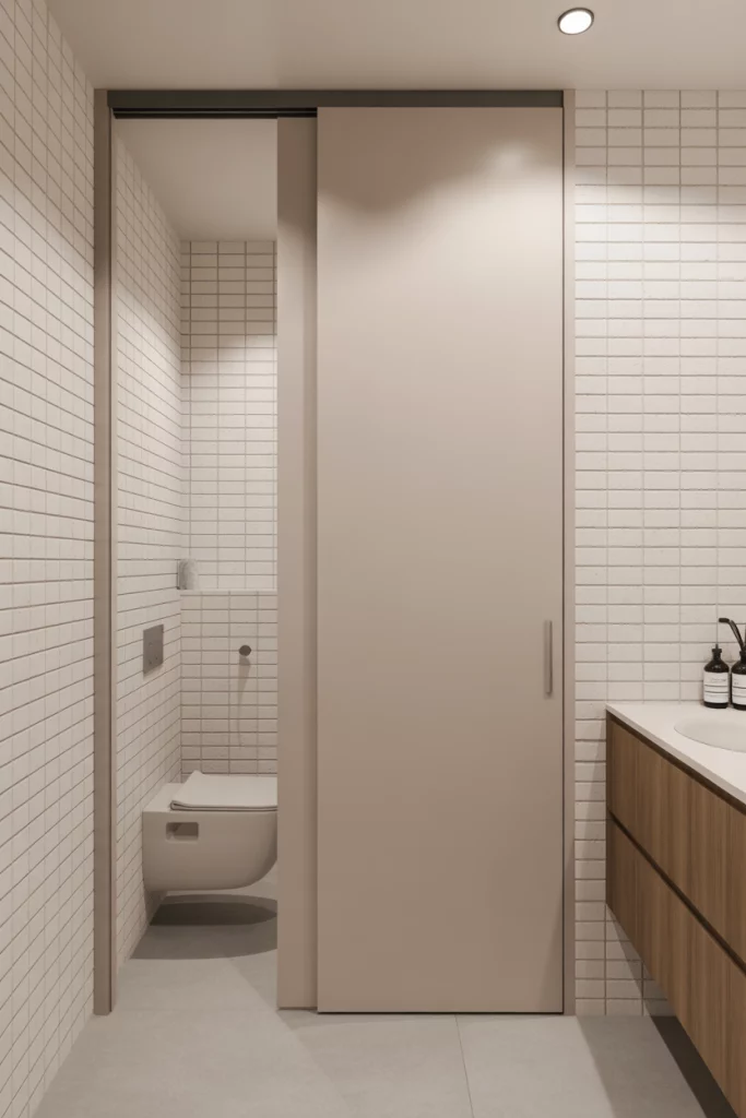 A super practical solution for tiny layouts is a sliding pocket door. It saves swing space, ideal for apartments or narrow layouts. Choose a modern glass version or rustic wood to match your style. Add decorating touches—like simple hooks or artwork—on the inner wall for personality without clutter.