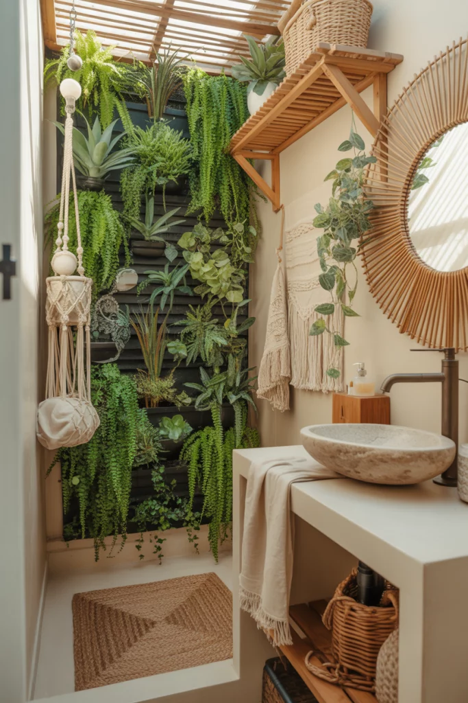 Infuse nature indoors by turning one wall into a green vertical garden. Even artificial greenery adds freshness and calm. This idea suits bohemian or coastal themes where natural textures thrive. Keep fixtures simple so plants stand out, and ensure good ventilation if real. Great for stress relief and eco vibes.