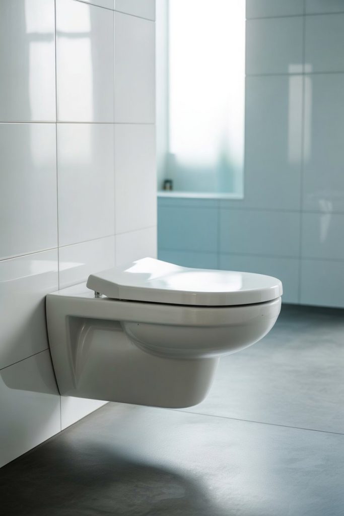 A modern floating toilet with a hidden tank visually enlarges the floor area. Pair with a minimalist wall-mounted sink and subtle lighting. Keep tones white, blue, or light gray for airiness. It’s very effective for small condo bathrooms seeking a sleek, spa-like upgrade.