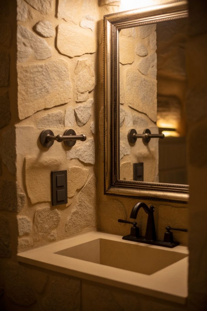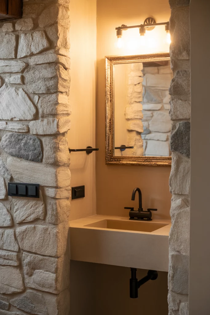 For a natural yet elegant feel, try textured stone walls in soft beige or gray. Combine with dark matte taps and vintage mirrors. This earthy mix feels simple yet refined.