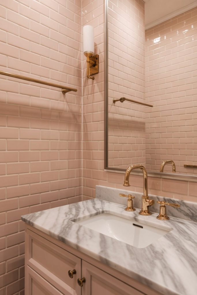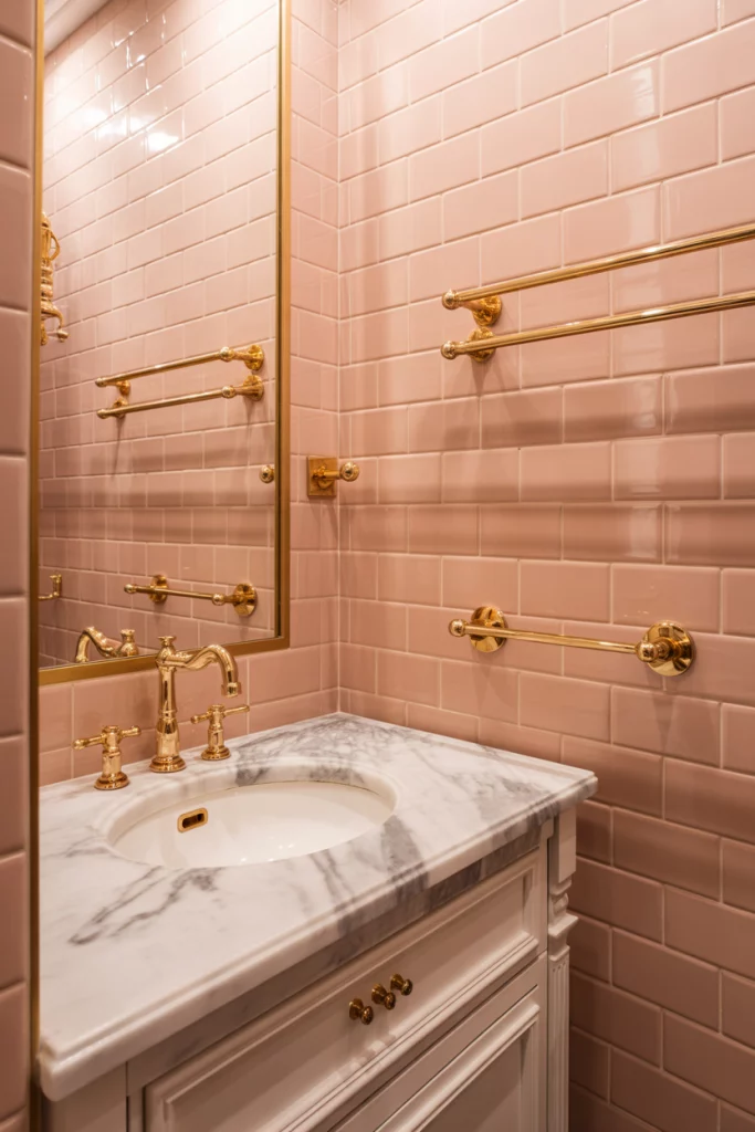 Adding pink accents brings instant personality. Combining blush tiles with brass fittings or marble tops yields a fabulous modern glam result. Keep bath fixtures minimal to avoid visual overload. This works beautifully in feminine or youthful interiors and proves small spaces can still feel indulgent.