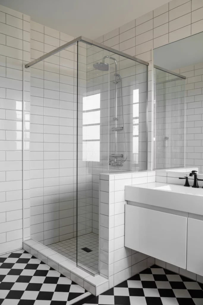A shower only walk-in is a perfect sleek minimalist choice. The frameless glass keeps the enclosure open and airy with black and white tiles or dark accents for modern contrast.